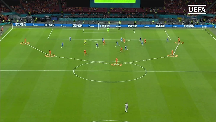 Тренерская комиссия тоже обратила на это особое внимание. Помимо финала, Франс Хук привел еще две яркие иллюстрации: «Нидерланды использовали тройку, а Украина играла с четверкой, из-за чего у них на регулярной основе возникали проблемы с контролем латераля на дальней части поля. Точно такая же картина повторилась в матче Германия – Португалия».