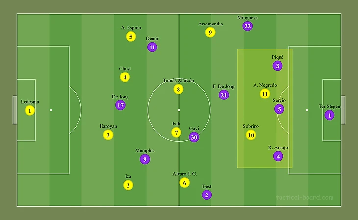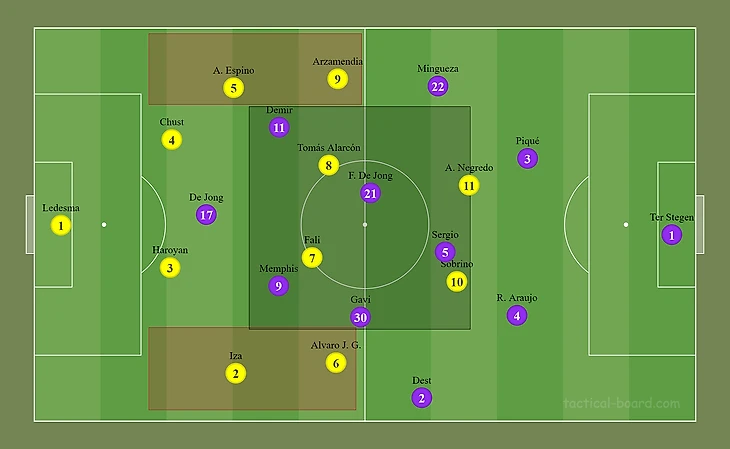 1. Стартовый состав «Барселоны» на матч был обусловлен чередой травм (Фати, Дембеле, Агуэро, Брейтуэйт, Педри, Альба, Бальде). Они наложили определённые ограничения: в частности, на левом фланге вынужден был выйти правоногий Дест, а на его позиции справа появился Мингеса, который изначально является центральным защитником. Приятно удивил выход Гави в числе 11 стартовых футболистов (о нём поговорим чуть позже). Показалось нелогичным появление Люка де Йонга с первых минут — лично я ожидал креативного Коутиньо для взламывания прогнозируемого «автобуса» соперника.