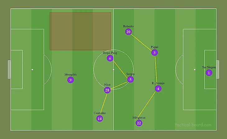 6. Во втором тайме вместо Демира на поле появился Роберто. В первой половине встречи Юсуф периодически оставался изолированным от команды: это было обусловлено перекосом атакующей игры на левый фланг, где находились Мемфис, Дест, Гави, а после выхода на поле и Коутиньо.