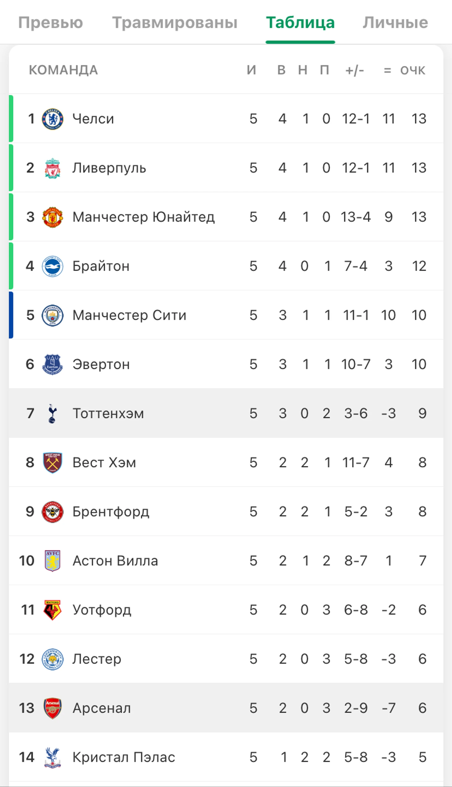 Таблица довольно динамично меняется в начале турнира, поэтому 3 очка и 6 позиций, разделяющие команды до старта 6 тура, не могут восприниматься без известной доли условности – победа канониров сблизит клубы на социально небезопасную дистанцию.