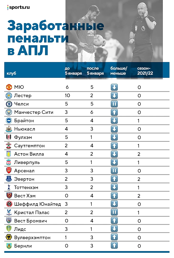 • Но ведь тренд касается не только «МЮ»: 10 команд тоже зарабатывают меньше пенальти. Сильнее всех просел «Лестер»: 10 пенальти до заявления Клоппа – и всего 2 после.