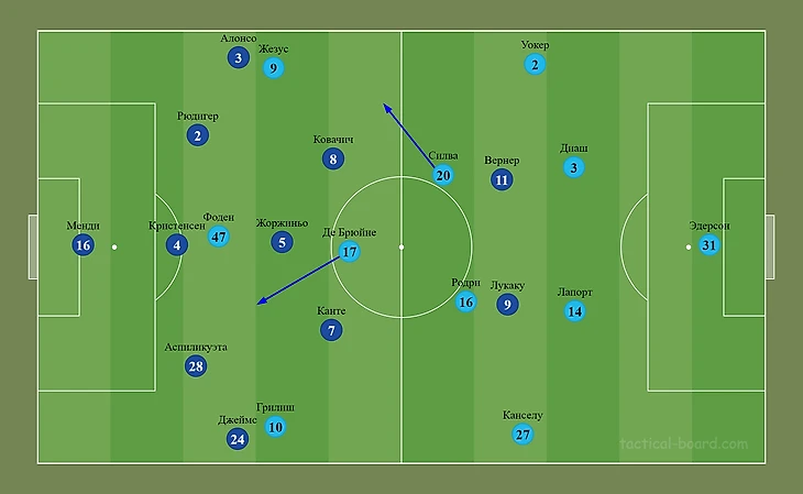 Этот гол как по щелчку пальцев перевернул характер матча. Игроки «Челси» активизировались (после гола владение 52% в их пользу) и стали быстрее двигать мяч. «Сити», похоже, был не против такого сценария, так как перестал высоко прессинговать и начал обороняться средним блоком. Тухель попробовал раскрыть игру, выпустив Хаверца вместо Канте и перейдя на 3-4-3 на 60-й минуте, что было разумным шагом, учитывая уровень реализации команд. Но это не принесло ожидаемых плодов – «Ман Сити» чувствовал себя довольно комфортно в таких условиях: именно на этом отрезке матча у них были самые опасные моменты, включая выход один на один Грилиша и удар Жезуса в пустые ворота, когда Рюдигер вынес мяч с линии ворот. В свою очередь, банда Тухеля так и не смогла создать что-то действительно опасное, имея по итогу лишь несколько неплохих подходов.