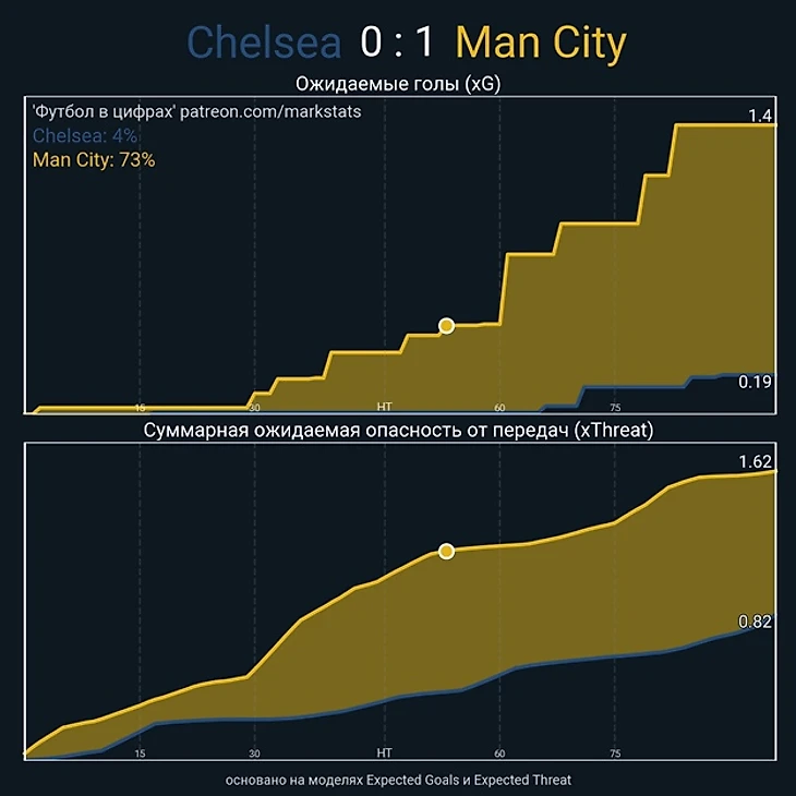 После перерыва не было видно, чтобы Тухель внес какие-то изменения в игру своей команды и сценарий 1 тайма продолжился. А вот Гвардиола сделал некоторые корректировки, и теперь оба фланговых защитника шли высоко, а «Челси» перестал их встречать и просто оборонялся уже низким блоком. У команды Гвардиолы появилась возможность быстрее переводить мяч с одного фланга на другой через центральных полузащитников. Это в конечном итоге привело к тому, что на 53-й минуте Жезус забил гол рикошетом после розыгрыша углового с передачи Канселу (которая была изначально ударом). Угловые – следствие сильного давления, поэтому гол нельзя назвать случайным или несправедливым.