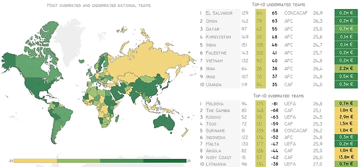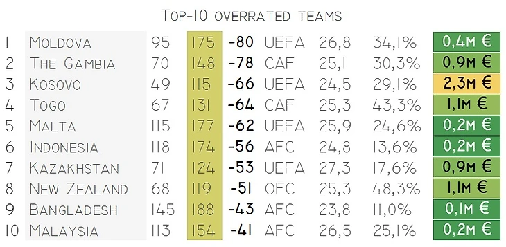 В топ-10 рейтинга перецененных команд ни одного представителя стран Нового Света, а лидирующие позиции захватили команды, представляющие Европу и Африку. При этом ни одна команда не входит в топ-100 рейтинга ФИФА, а самую высокую позицию занимает сборная Косово, расположившаяся на 115-ом месте. Эта же сборная является и самой дорогой среди переоцененных команд. У косоваров молодая сборная, состоящая на 92% из игроков, выступающих в зарубежных клубах. При этом костяк команды составляют игроки, выступающие за клубы из "европейской пятерки": Амир Рахмани (14 млн €) из "Наполи", Милот Рашица (9 млн €) из "Норвича" и Ведат Мурики (9 млн €) из "Лацио". Имея такой крепкий состав, Косово обыгрывает только сборные уровня Мальты, Молдовы и Гамбии, еще одних представителей рейтинга переоцененных команд.