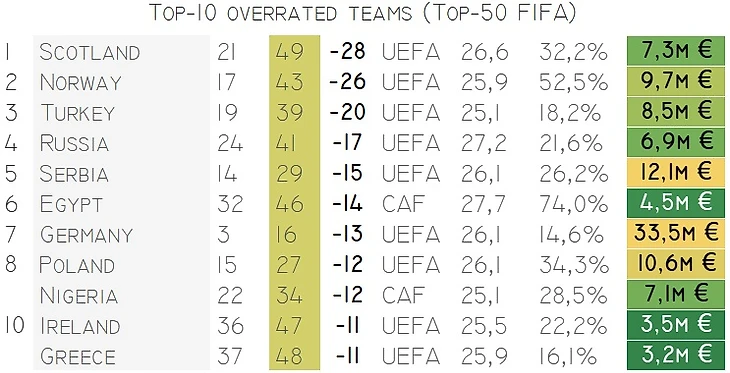 Главная причина присутствия в рейтинге сборных Египта и Норвегии - несбалансированность состава из-за стоимости своих главных звезд, Мохаммеда Салаха и Эрлинга Холанда, соответственно. Если не брать в расчет вышеупомянутых футболистов, то результаты норвежцев и египтян, в целом, соответствуют среднему уровню футболистов команды.