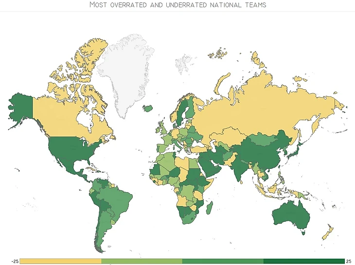 Для начала разберем, как формировалась карта. Изначально был составлен рейтинг средней стоимости национальных сборных за 2020-2021 года. Затем для каждой команды из места в этом рейтинге вычиталось место в рейтинге ФИФА. Соответственно, если мы получаем положительное значение, значит сборная переоценена, отрицательные - недооценена. Переоцененные сборные на карте выделялись песочным цветом, недооцененные - темно-зеленым.