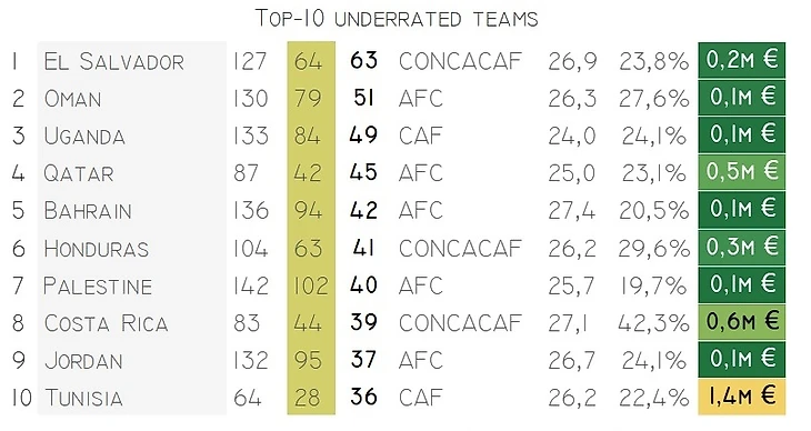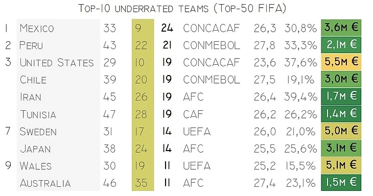 У американцев же в свою очередь аномально молодая команда, главные звезды которой выступают в Европе - легионерами являются 51,7% игроков. При этом на последний Чемпионат мира американцы не пробились, а сборная Мексика вылетела уже в 1/8 финала. Высокое место в рейтинге ФИФА этих сборных обусловлено в первую очередь успехами в совершенно неконкурентной конфедерации Северной и Центральной Америки, поэтому непонятно на сколько корректно формирование рейтинга ФИФА в его нынешнем виде. Из европейских команд выше всех в рейтинге недооцененных команд располагается сборная Швеции. Скандинавы лидируют по потерянным очкам в своей отборочной группе к Чемпионату мира-2022, а на последнем Евро вылетели в 1/8 финала, заняв при этом первое место в группе. В целом, в таблице недооцененных команд из топ-50 сборных рейтинга ФИФА большинство команд являются возрастными (6 из 10) и сбалансированными (7 из 10).