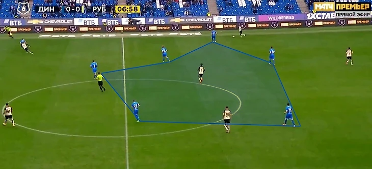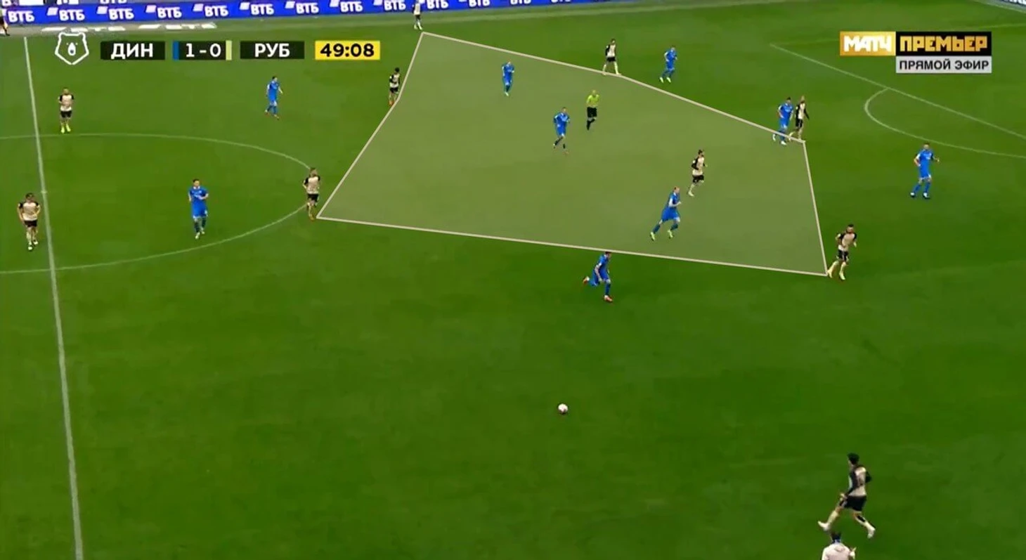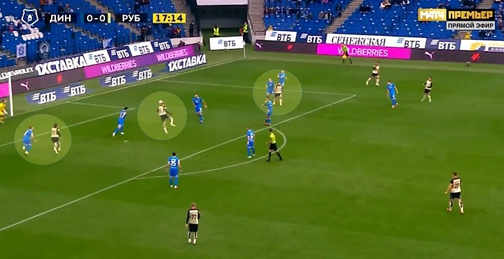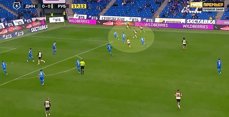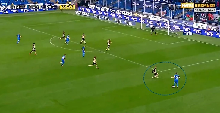 Команда Шварца качественно чередовала отрезки интенсивности и грамотно встречала атаки «Рубина». «Динамо» пыталось прессинговать двумя способами – их можно различить по давлению на фланговых защитников. Если крайний нападающий давил на одного из центральных защитников «Рубина», то встречать Самошникова или Костюкова выдвигалась ближайшая к флангу восьмёрка, а Грулёв перекрывал ближнего опорника.
