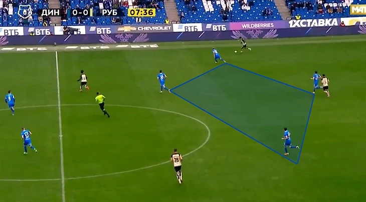 «Рубин» создавал численное преимущество в этой зоне и доводил до удобной ситуации для навеса или прострела в опасную зону. В штрафной чаще всего уже были три или четыре игрока, готовые побороться за мяч. Но реально напрячь оборону «Динамо» не получалось из-за предсказуемости и медленного движения мяча.
