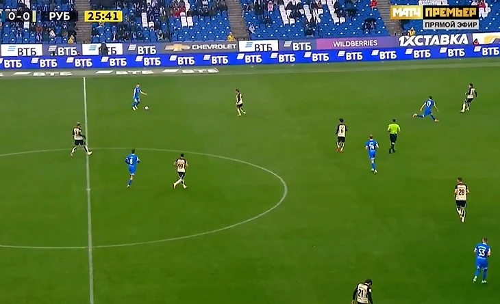 Если же гости владели мячом длительный отрезок времени, то структура «Рубина» уже не была такой узкой. При этом Кварацхелия и Дрейер всё равно чаще тяготели именно к полуфлангам. На фланги к ним и к защитнику мог прийти один из опорников или Хакшабанович – черногорский футболист с позиции «десятки» часто опускался ниже для помощи в развитии атак.