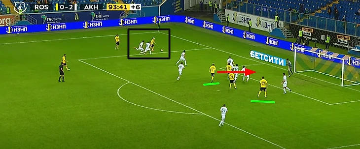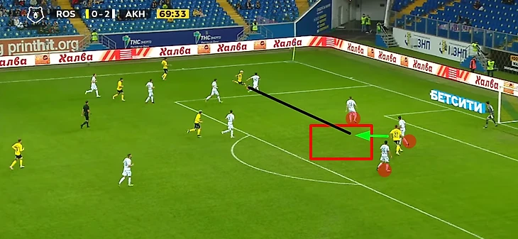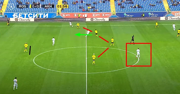 Менее чем за сутки кардинально что-то поменять экс-тренеру "молодежки" прогнозируемо не удалось. Ростов так и вышел в 5-4-1 с узкой линией полузащитников. Без мяча основная ставка делалась на насыщение центральной зоны, нежели на привычный для "Карпинского" Ростова высокий прессинг. Какая-то да идея все же присутствовала, и уже на 2-ой минуте дончанам удалось перехватить мяч на чужой половине поля.