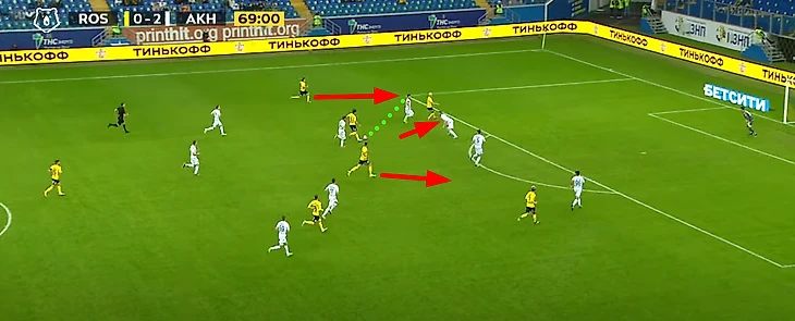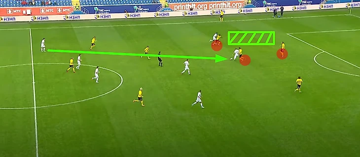 Основным приемом против подобной схемы очевидно являются фланговые атаки. Используя пас в касание на ближнего, футболисты в белом легко обыгрывали выбегающих крайних защитников, делая яркий акцент на правую сторону поля.