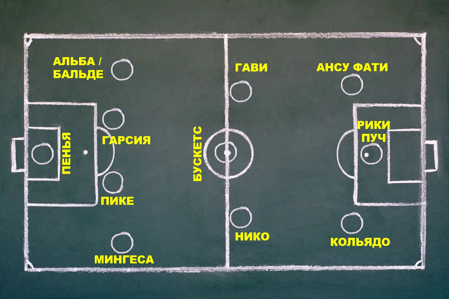 С учётом того, что Жорди Альба, Серхи Роберто и Алехандро Бальде сейчас травмированы, то, теоретически, можно увеличить количество кантерано на поле до 11 человек, однако, возникает вопрос о том, кто будет играть в атаке и на воротах. Если мы такое и увидим, то лишь в матче Кубка Испании против команды из низших лиг, когда результат уже будет сделан. Однако, Кольядо не имеет права играть до 1 января 2022, поэтому правым вингером может быть разве что Серхи Роберто.Такой состав может выглядеть следующим образом (пускай это и похоже на фантастику):