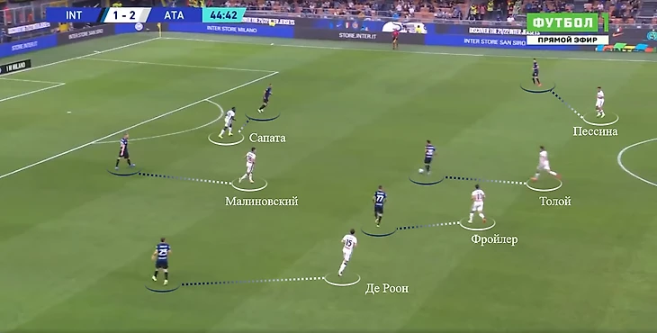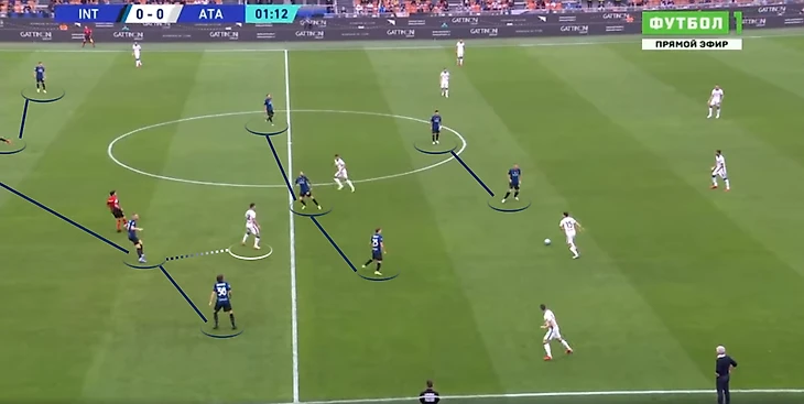 "Аталанта" при билдапе впечатлила не настолько же сильно, как "Интер". Хозяева особо не стремились высоко встречать соперника (что особенно просматривалось в первом тайме), однако в погоне за вертикализацией игры гости иногда выбирали не самые оправданные в плане риска варианты передач.