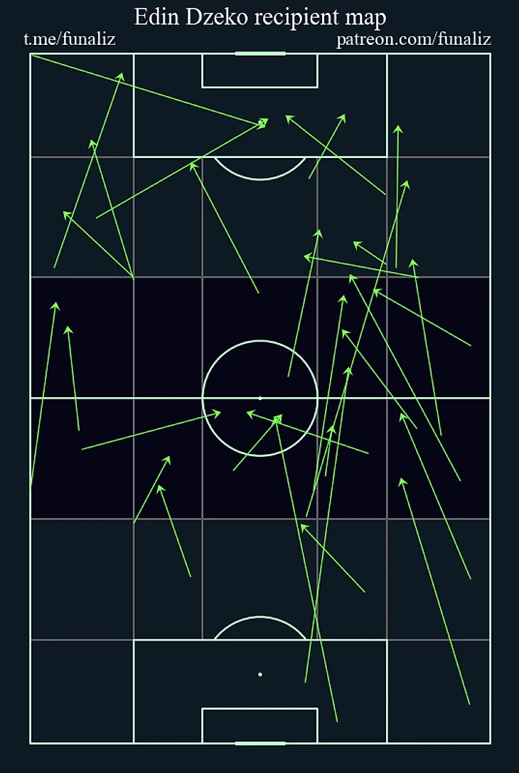 Для Джеко высокая вовлечённость (включая приём большого, по меркам нападающего, количества передач в недодачу) — характеристика ещё со времён как минимум "Ромы", здесь это его качество эксплуатировалось сполна. Эдин являлся адресатом 49 передач, из которых принял 34. Причем 12 из них — с продвижением, общий вес принятых передач — 0,55 xT.