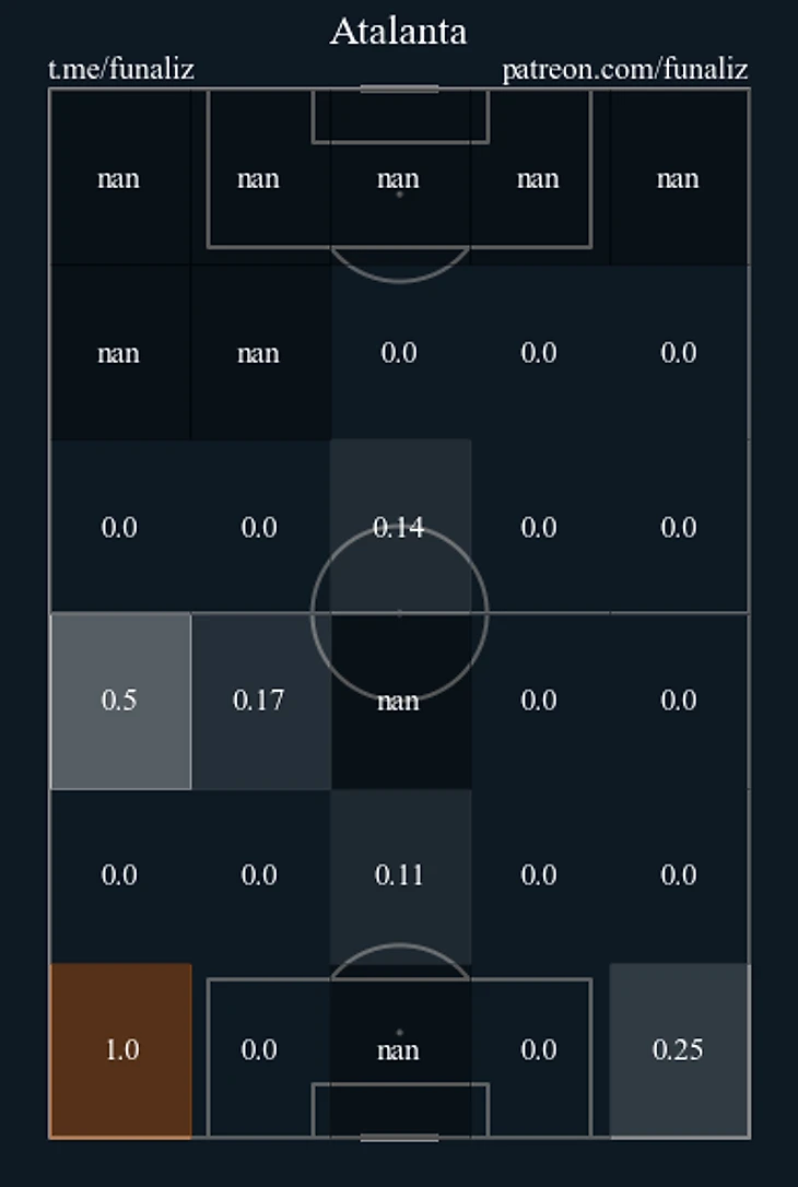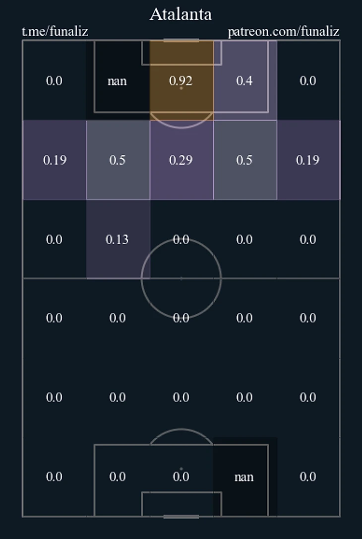 Интересный момент — если просто взять показатель "дуэли", то "Аталанта" демонстрировала нормальные показатели в створе своих ворот, однако на деле же в конце матча плохо контролировала эту зону — к слову о том, что важно смотреть не только на координаты зон, где происходит борьба, но и на ситуации, которые по ивент-данным борьбой не считаются.