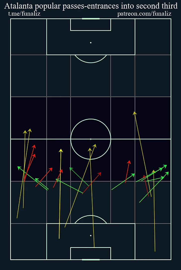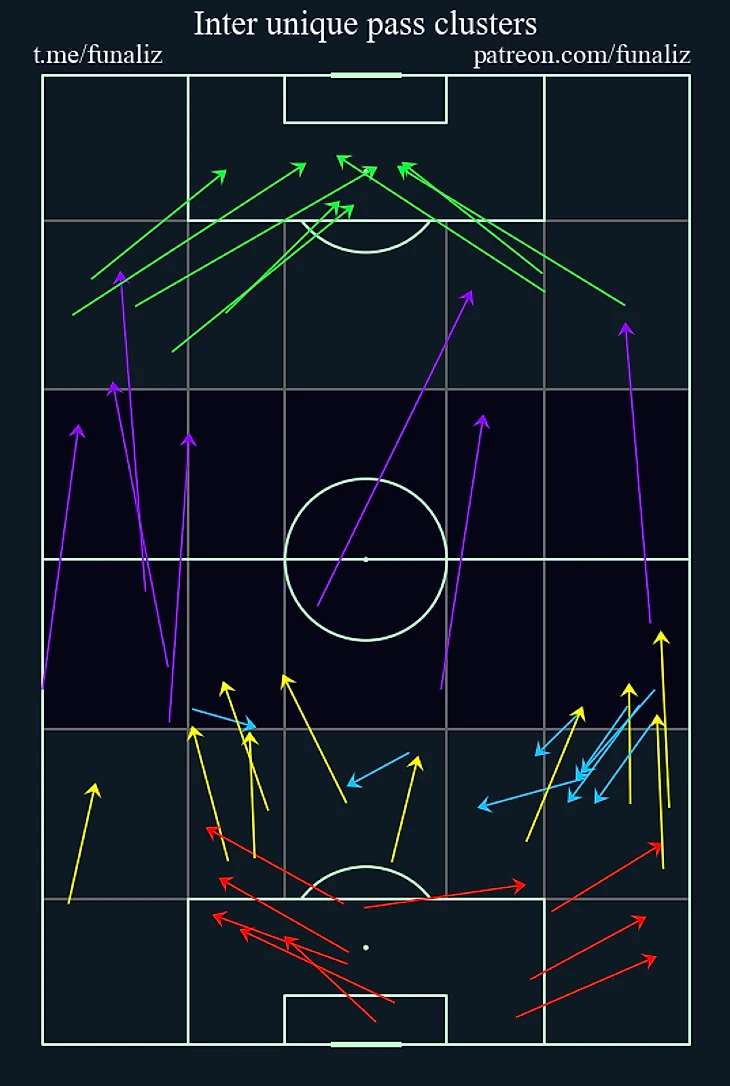 На иллюстрациях выше довольно отчётливо видно, что "Аталанта" довольно прямолинейно распоряжалась мячом внутри своей трети (особенно — в ближней к воротам 1/6), хотя, повторимся, масштабного давления "Интер" не оказывал. Этот момент просматривается даже через выходы во вторую треть — там всё уже не так вертикально (красный и зелёный кластеры), однако помеченный жёлтым класс передач, лишь одна из которых была точной, всё же намекает на то, о чём говорилось выше.