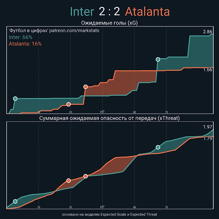 Если просто посчитать отрезки доминирования команд, то получится 2:1 в пользу "Интера", да и по ожидаемым очкам миланцы впереди — всё же к победе была чуть ближе именно команда Индзаги.