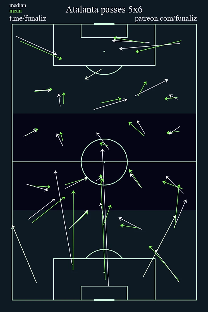 Карта передач "Аталанты" по 30 зонам (медианные и усреднённые координаты)