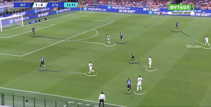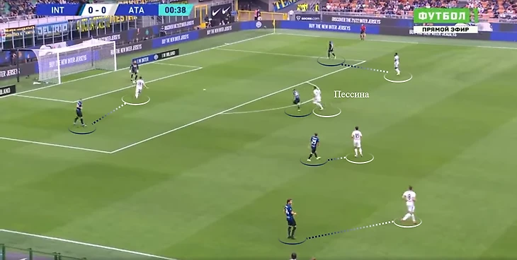 Всё же в итоге "Аталанта" больше придерживалась варианта ориентировок, где Пессина играет по Бастони — регулярно менять персональные установки в зависимости от ситуации довольно проблематично (хотя бы в силу того, что игроки могут одни и те же ситуации трактовать по-разному).