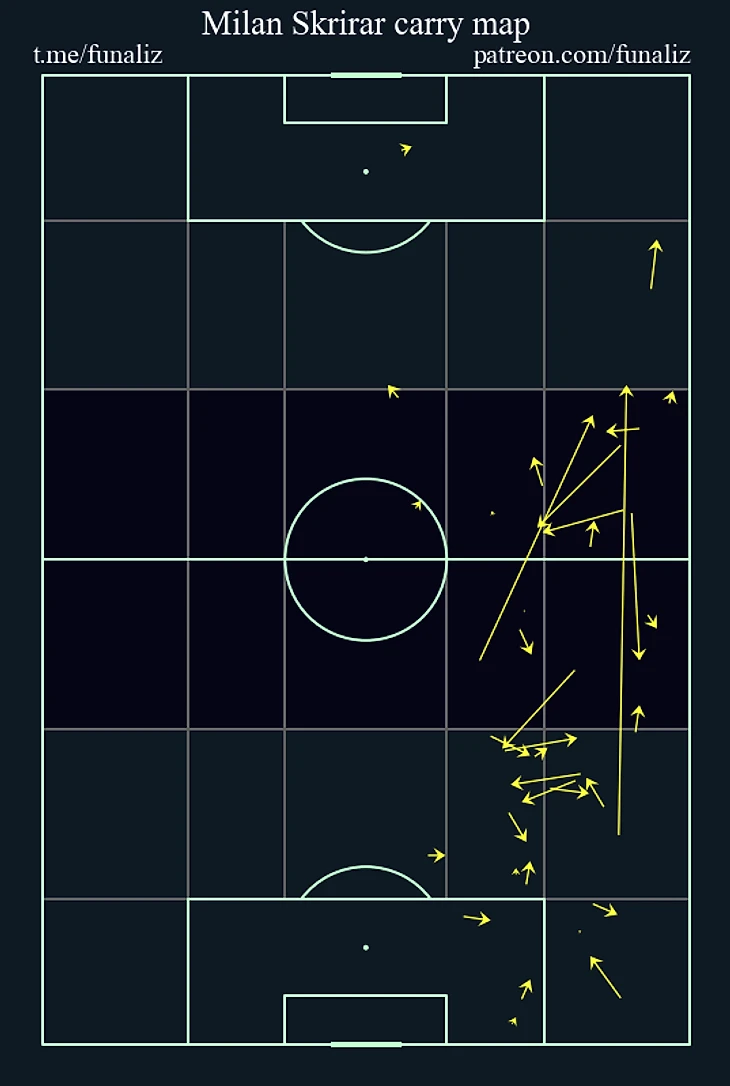 А рывки центральных защитников с мячом носили более эпизодический характер, что вполне логично. Вдолгую на такое полагаться довольно опрометчиво в силу того, что даже на уровне принятия решения "идти/не идти" ключевое значение играет оценка игроком конкретного эпизода — поэтому тут в большинстве случаев будет установка из разряда "по возможности и при уверенности в том, что это не приведёт к привозу". В итоге ни Бастони, ни Шкриньяр, ни де Врей не привезли в таких ситуациях, но и какой-то ощутимой пользы их рывки не принесли.
