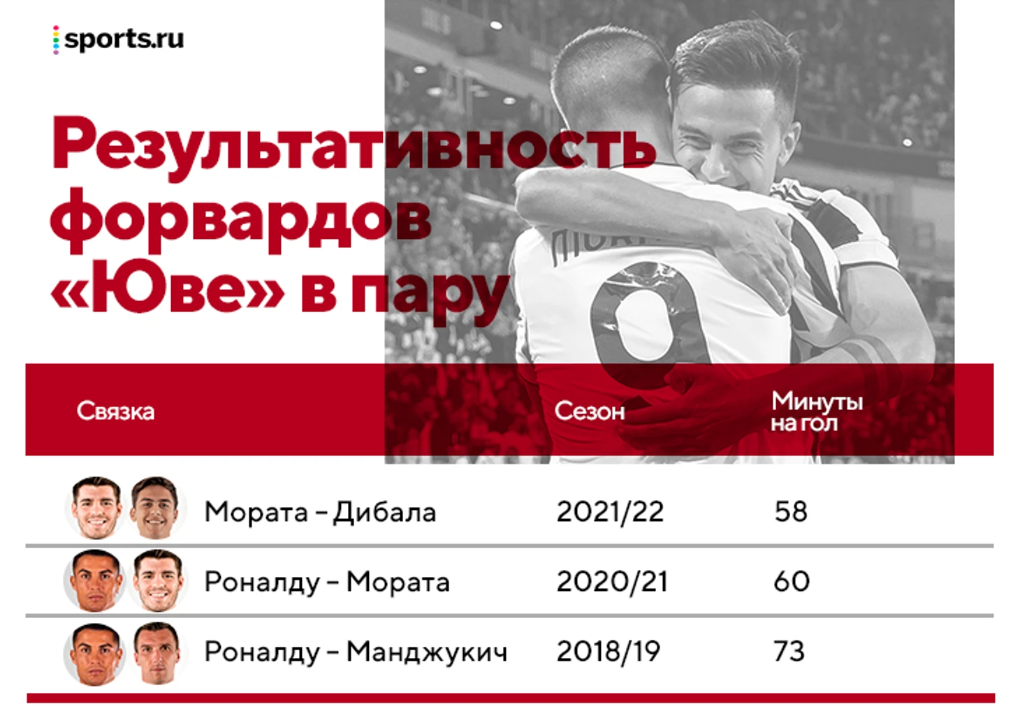Еще выраженнее этот эффект в цифрах всей атакующей линии. Пара Дибала – Мората забивает каждые 58 минут и превосходит любую связку с Роналду. Особенно показательно сравнение с дуэтом Манджукич – Криштиану времен Аллегри. Дибала и Мората заметно острее. Прошлогодняя пара Роналду – Мората показывала сопоставимые цифры, но в этом сравнении условия неравны: Пирло активнее атаковал и давал нападающим больше времени и возможностей для голов, чем Макс.