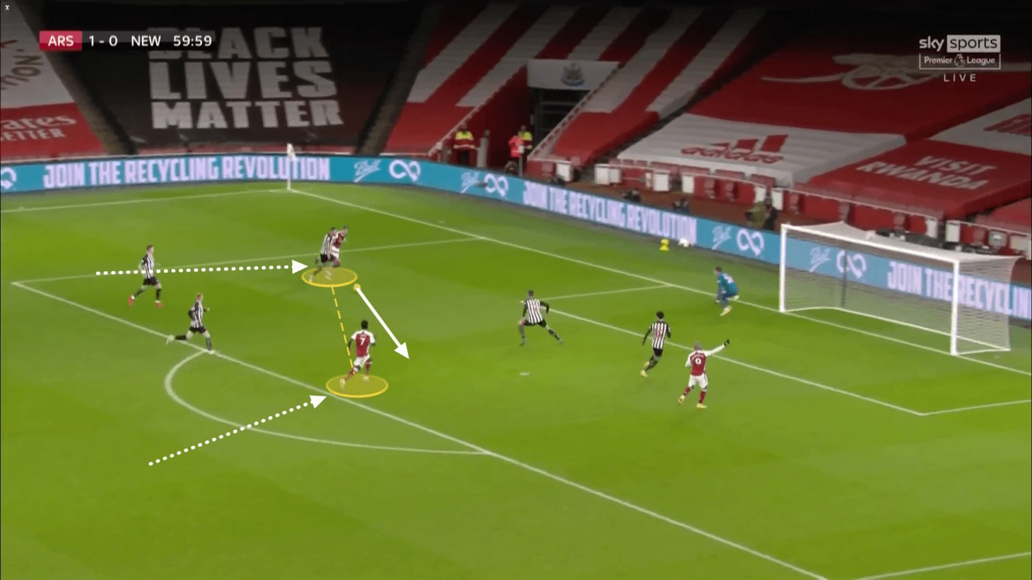 В эпизоде из игры с «Ньюкаслом» Смит Роу был как бы спрятан за защитником в черно-белой форме, тем не менее изловчился отдать точный и, что не менее важно, удобный пас на партнера по команде.