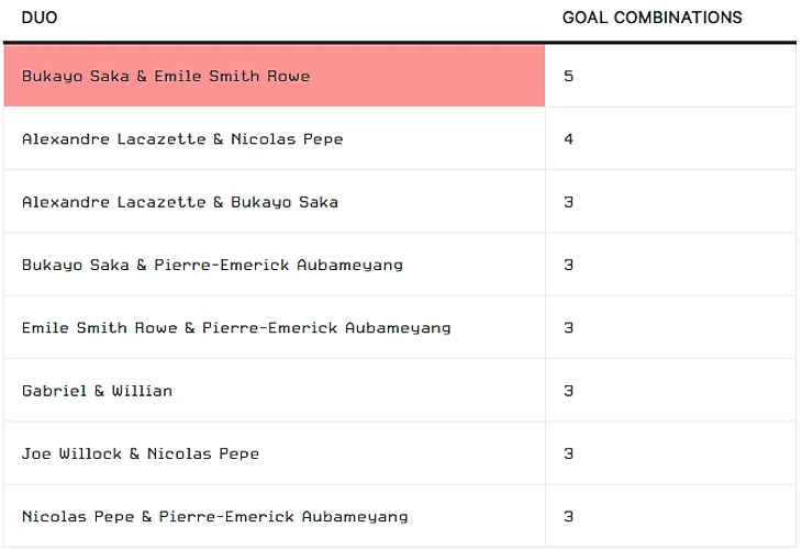 Разумеется, парни лучшие по цифрам взаимодействия в этот сезоне с «Арсенале». Вот таблица результативных комбинаций (кубковые матчи включены).