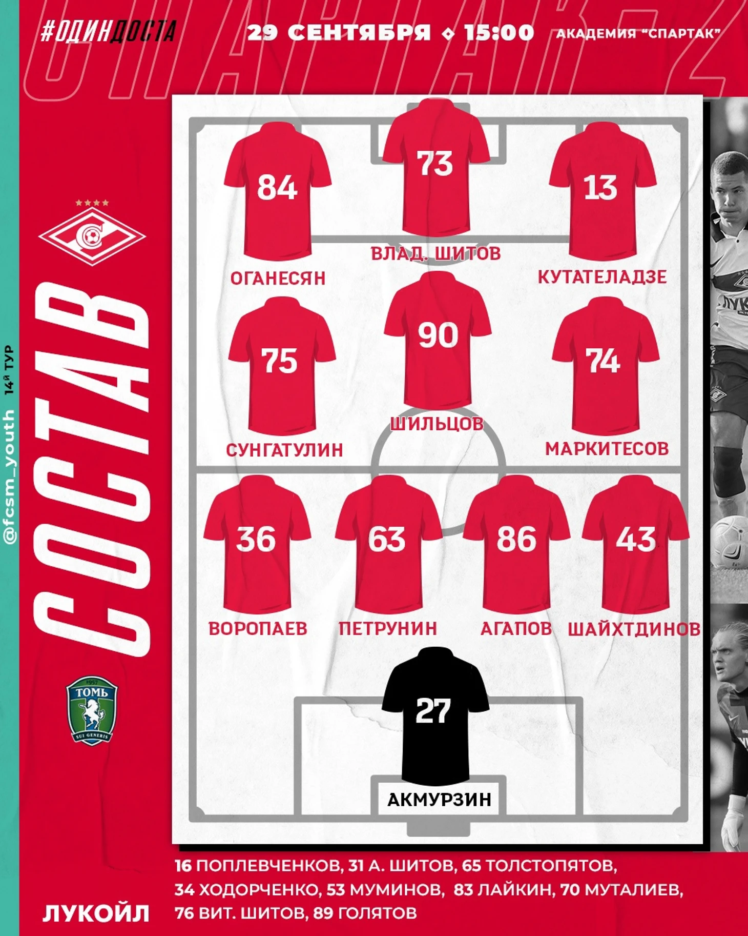 «Спартак-2»: Акмурзин, Шайхтдинов, Агапов, Петрунин, Воропаев, Сунгатулин (к), Маркитесов, Шильцов (Муминов, 90), Оганесян, Кутателадзе (Вит. Шитов, 46), Влад. Шитов.