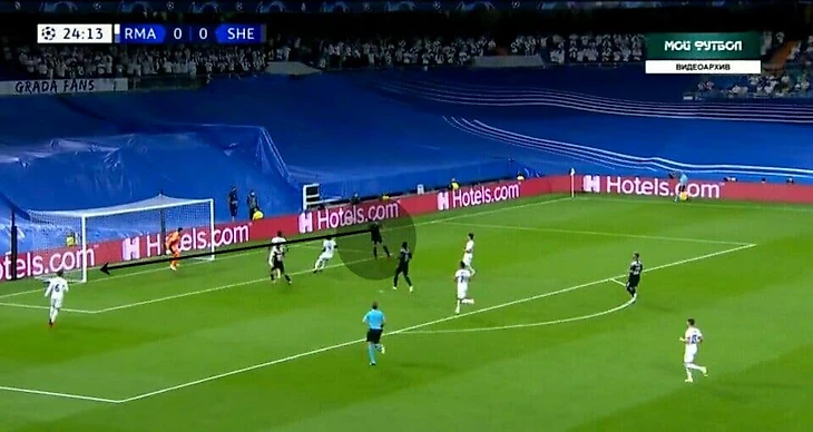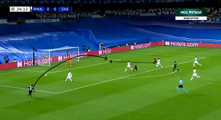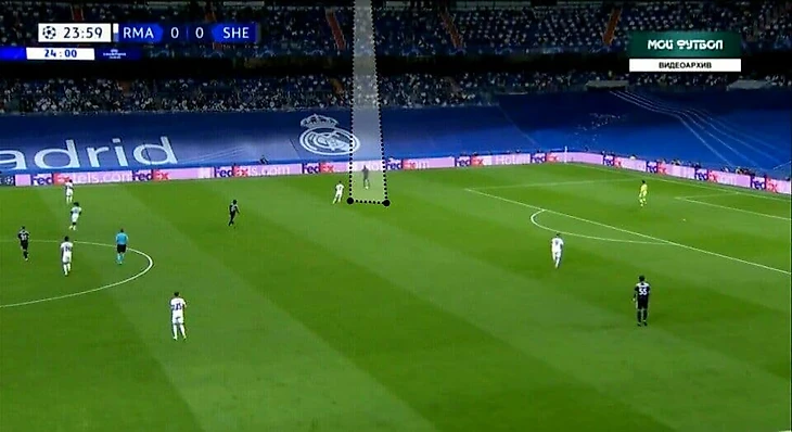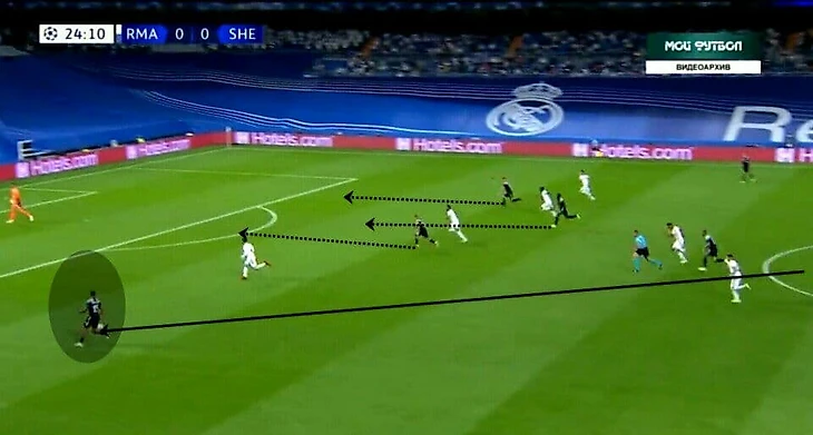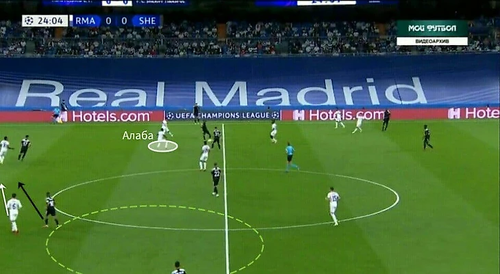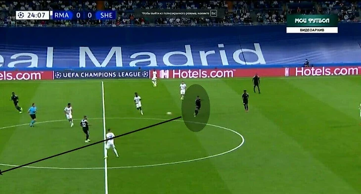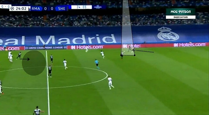 Обратите внимание, этим движение игрок Шерифа также уводит Алабу - центрбека мадридцев. А ещё, смотрите на ближний к вам фланг - мы же отмечали высокие позиции фулбеков, так вот, вингер уводит крайнего защитника Реала, тем самым открывает пространство для фулбека: