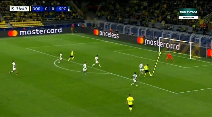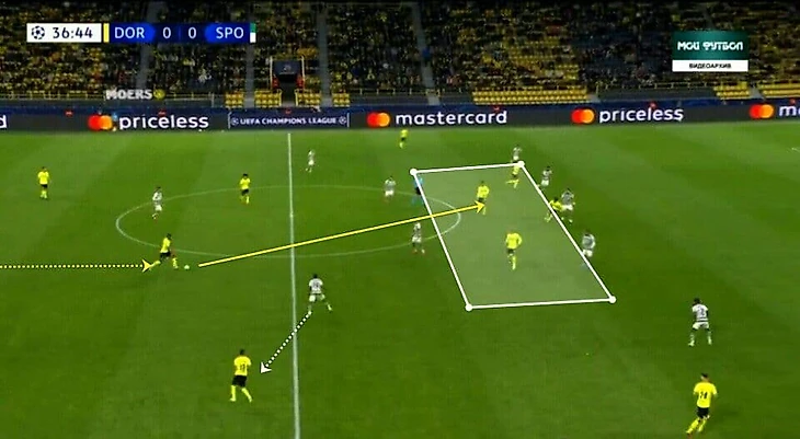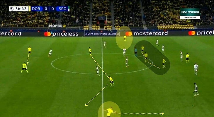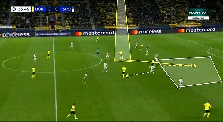 Расположение в формации 4-2-3-1 с высокими позициями фулбеков от Дортмунда против 5-4-1 Спортинга, и что интересно - узкое расположение игроков между линиями обороны и полузащиты от дортмундцев, которое создавалось за счёт движения в центр вингеров. Но самое важное движение здесь - опускания одного из полузащитников дортмундцев на позицию фулбека, за счёт чего он увёл соперника и освободил пространство, а также дал возможность подняться выше фулбеку: