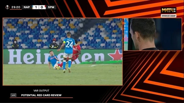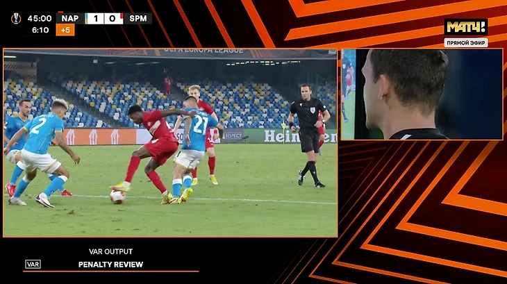 И даже это было еще не все! Уже в добавленное к первому тайму время Промес упал в штрафной «Наполи» после контакта с ногой Политано. Арбитр уверенно указал на точку, но и тут вмешался ВАР – теперь уже не в пользу «Спартака».