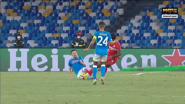 Кружльяк после просмотра повтора на мониторе изменил решение – кажется, все правильно сделал. Изначально судья увидел удар по ноге Промеса, но на повторе видно, как сам Квинси приземляется на стопу Политано после дерзкого разворота. Есть даже вопрос по равновесию голландца – но это уже второстепенный нюанс.
