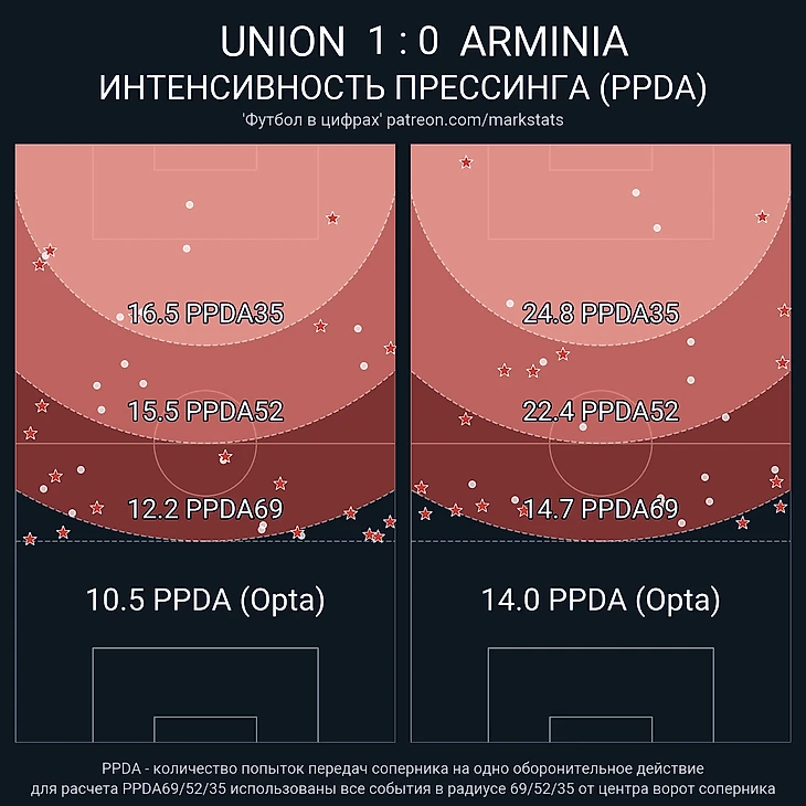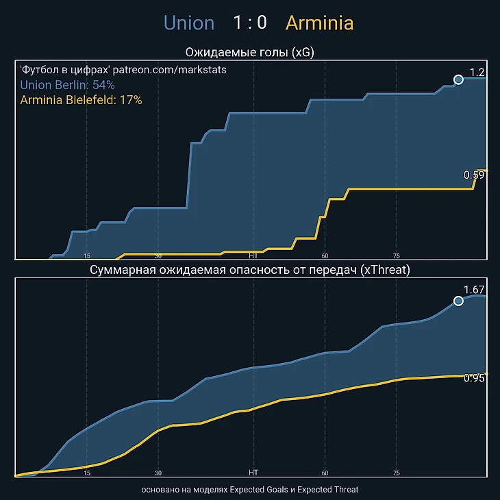 Унион Берлин 1:0 Арминия ▪ Ожидаемые голы (NPxG): 1.2 - 0.59