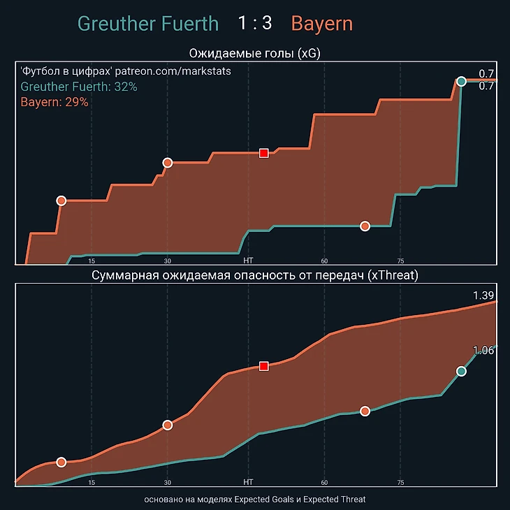 Гройтер Фюрт 1:3 Бавария ▪ Ожидаемые голы (NPxG): 0.7 - 0.7