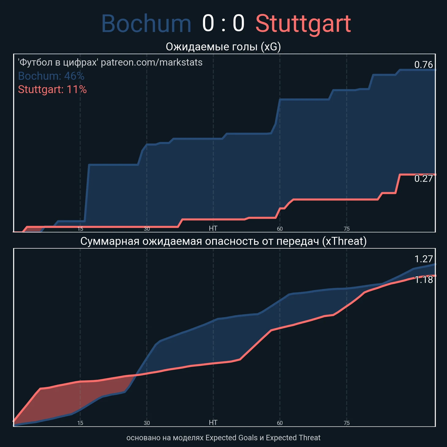 Бохум не забивает на выезде в 2 матчах из 3 Бохум не пропускает дома в 2 матчах из 3 В 4 матчах Штутгарта из 6 играл ОЗ да ( в сезоне 18/19 44.1% матчей 15/34; 20/21 67.5% матчей 23/34) В 4 матчах Штутгарта из 6 играл ТБ 3,5 ( в сезоне 18/19 38.2% матчей 13/34; 20/21 41.1% матчей 14/34) Следите за успехами команд Германии в моем блоге
