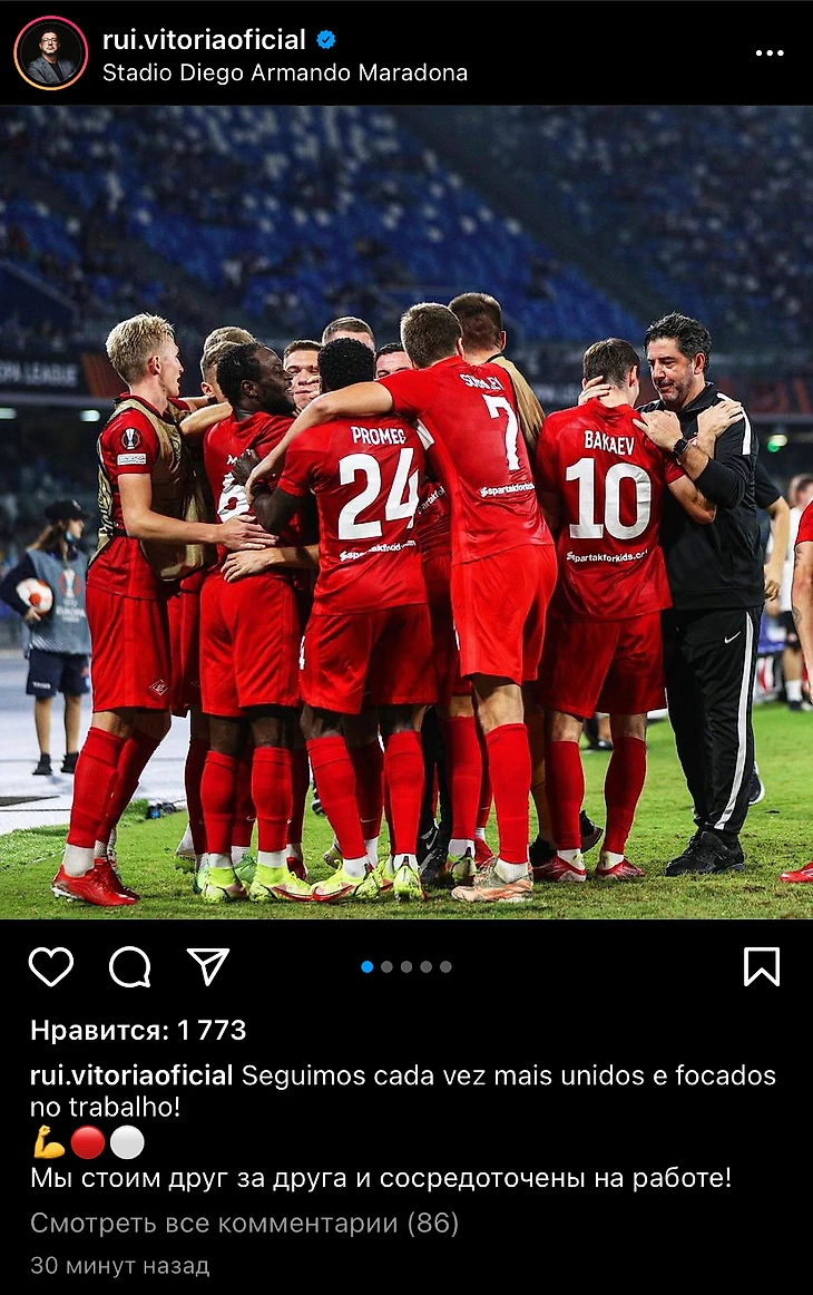 Главный тренер «Спартака» Руй Витория опубликовал у себя в Instagram пост, посвященный победе над «Наполи» (3:2) в матче 2-го тура групповой стадии Лиги Европы.