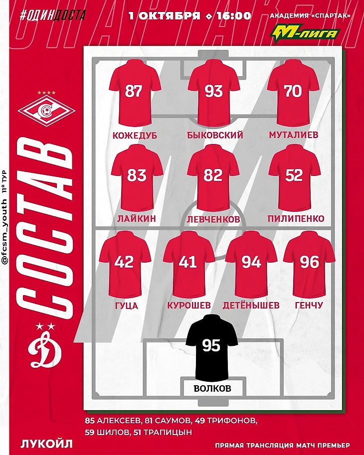 «Спартак»: Волков, Генчу, Детёнышев (к), Курошев, Гуца, Левченков, Пилипенко (Трапицын, 46), Лайкин, Муталиев, Кожедуб, Быковский (Трифонов, 49).