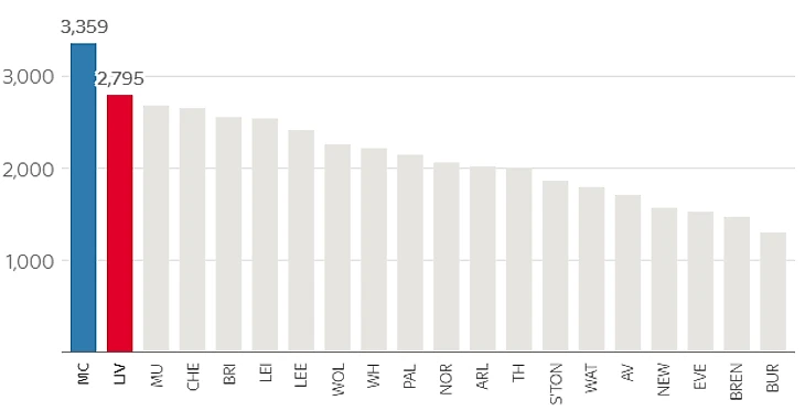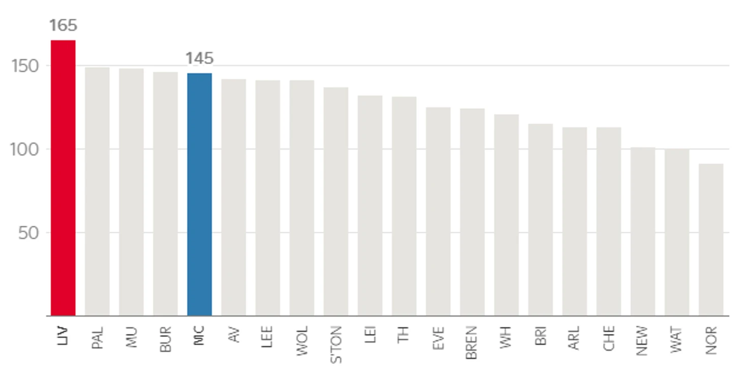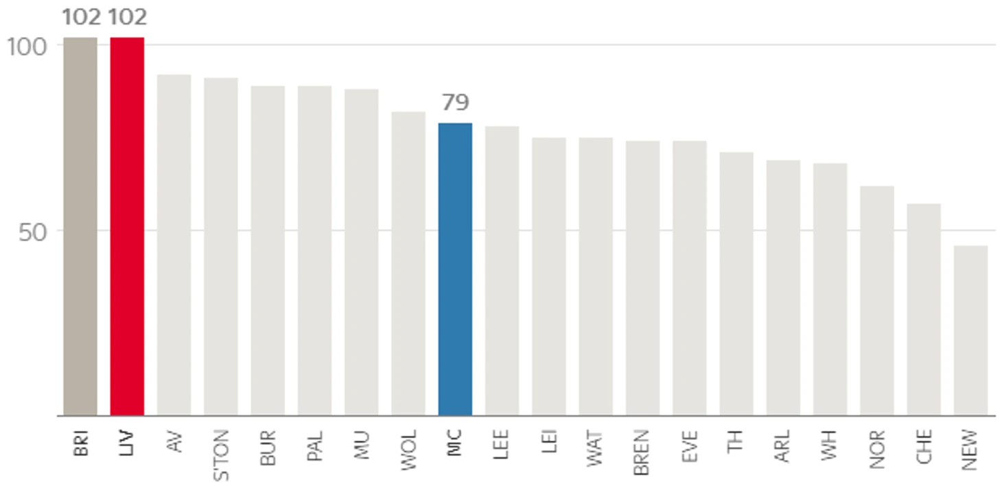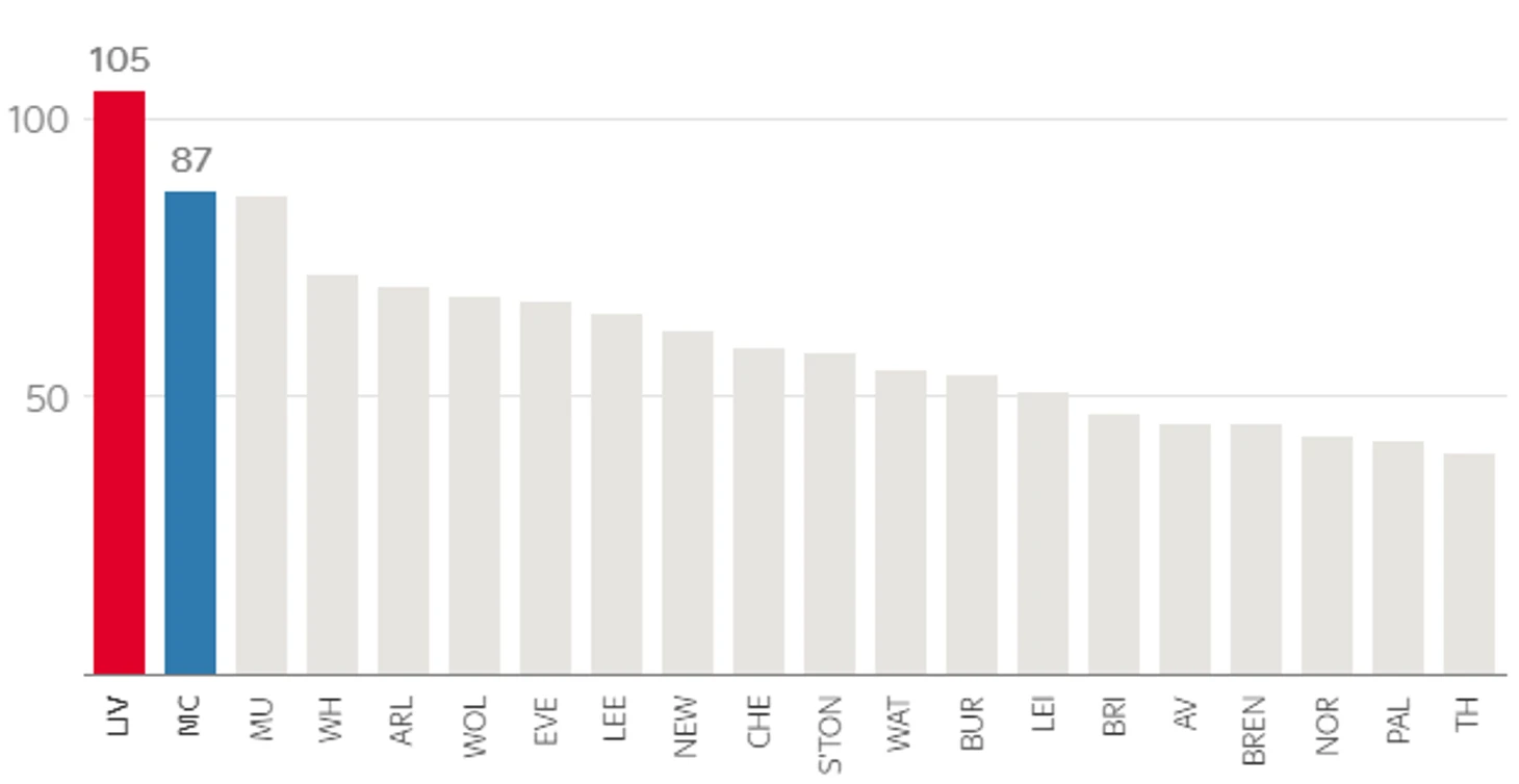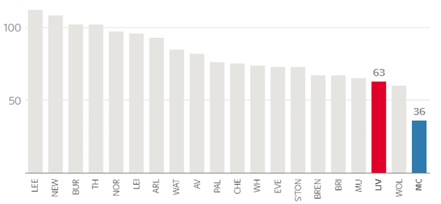 Обе команды "страдают" от физических нагрузок под руководством своих нынешних менеджеров, но свое лидерство давно уступили. Возможно, их высокие модели игры позволяют работать более компактно и, следовательно, не охватывать все поле. "Горожане" заняли 14-е место по проделанному километражу, что заметно ниже по сравнению с предыдущими сезонами.