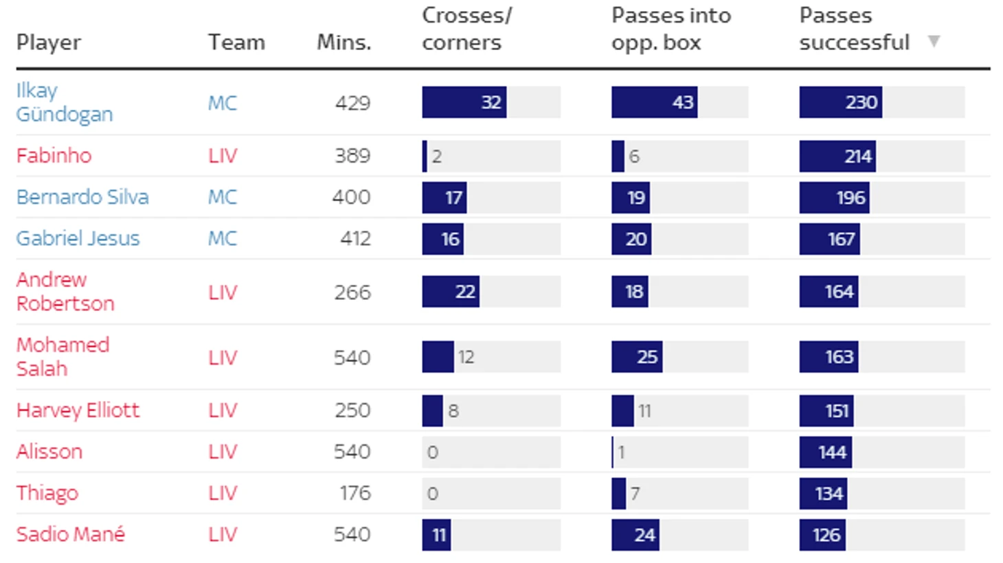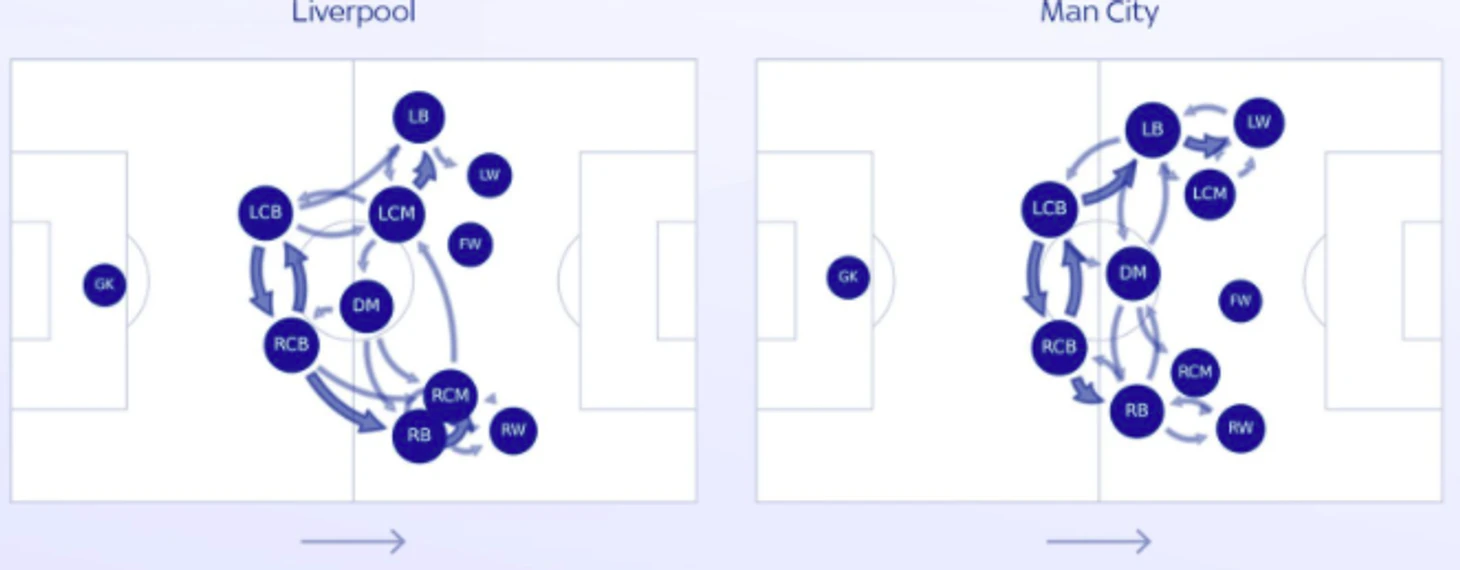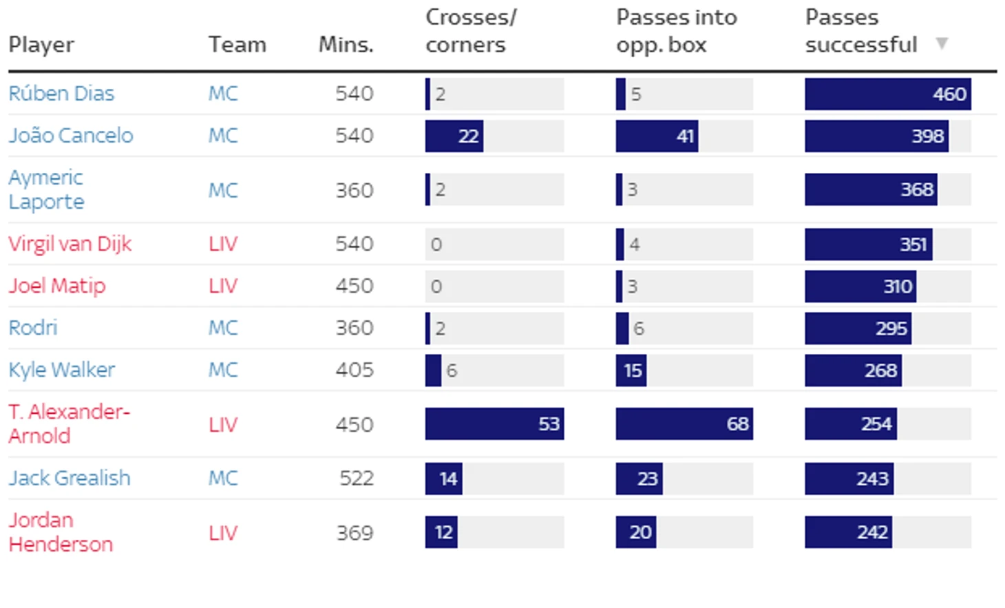 Рубен Диаш и Канселу делают наибольшее количество передач, при этом часто контролируют мяч, продвигая его из глубины, а центральные защитники Ливерпуля по большей степени играют на команду.