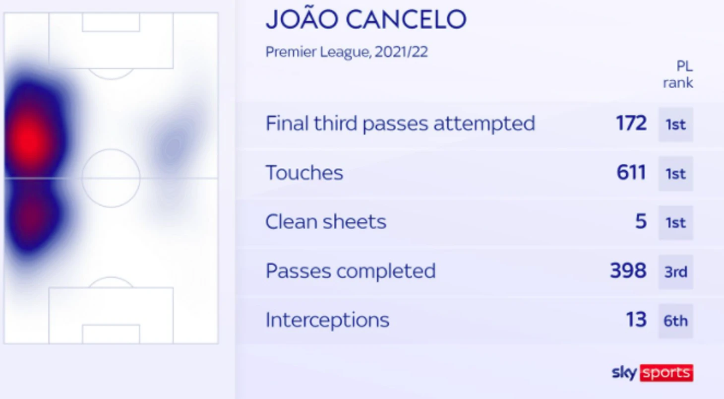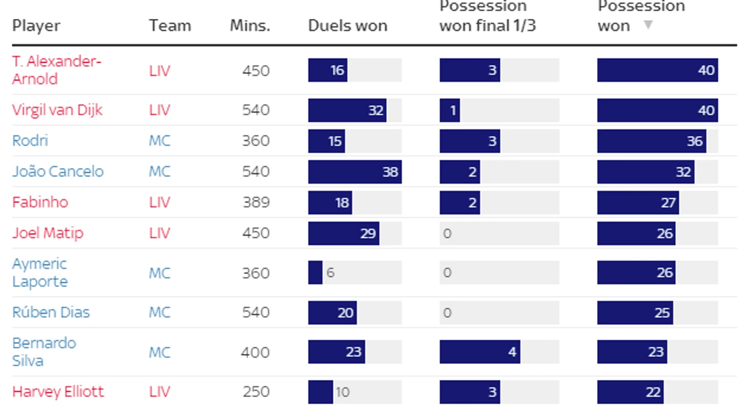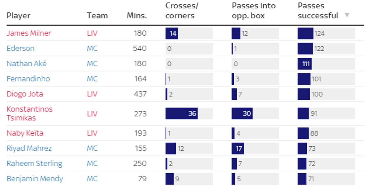 Рубен Диаш и Канселу делают наибольшее количество передач, при этом часто контролируют мяч, продвигая его из глубины, а центральные защитники Ливерпуля по большей степени играют на команду.