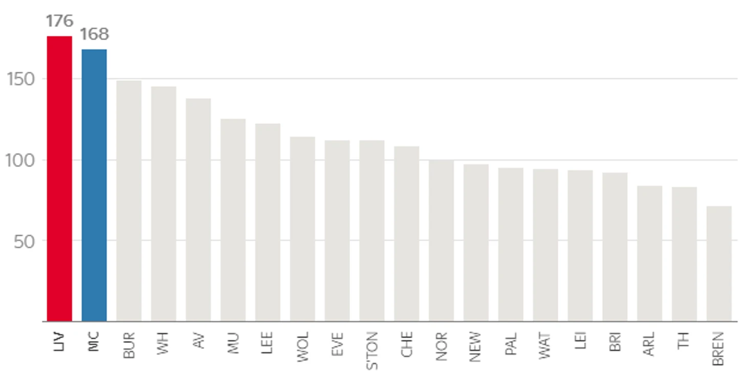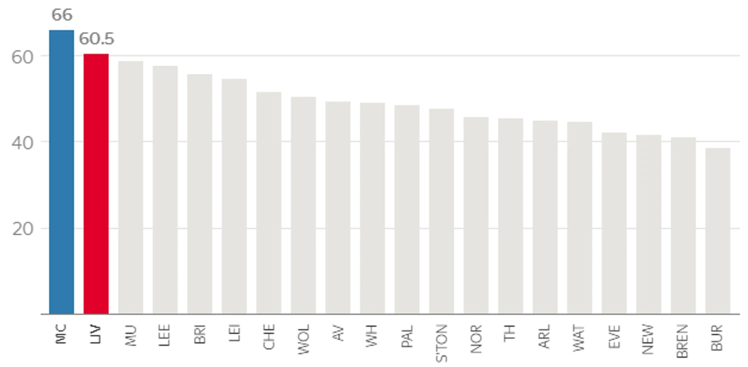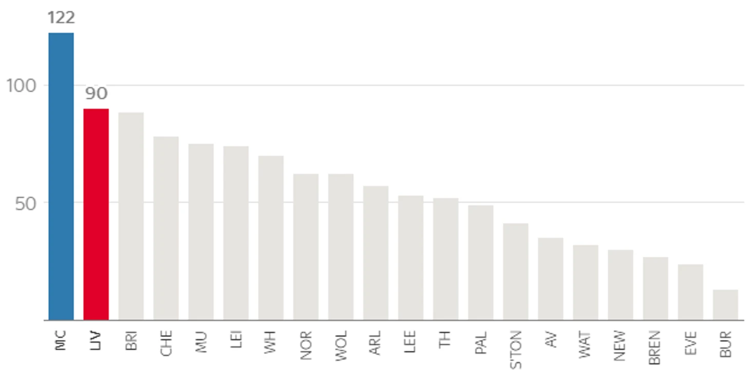 "Сити" и "Ливерпуль" возглавляют таблицу по количеству выполненных передач и владению мячом в этом сезоне.