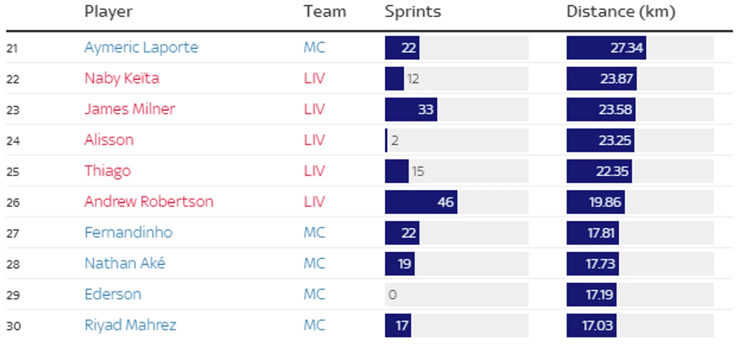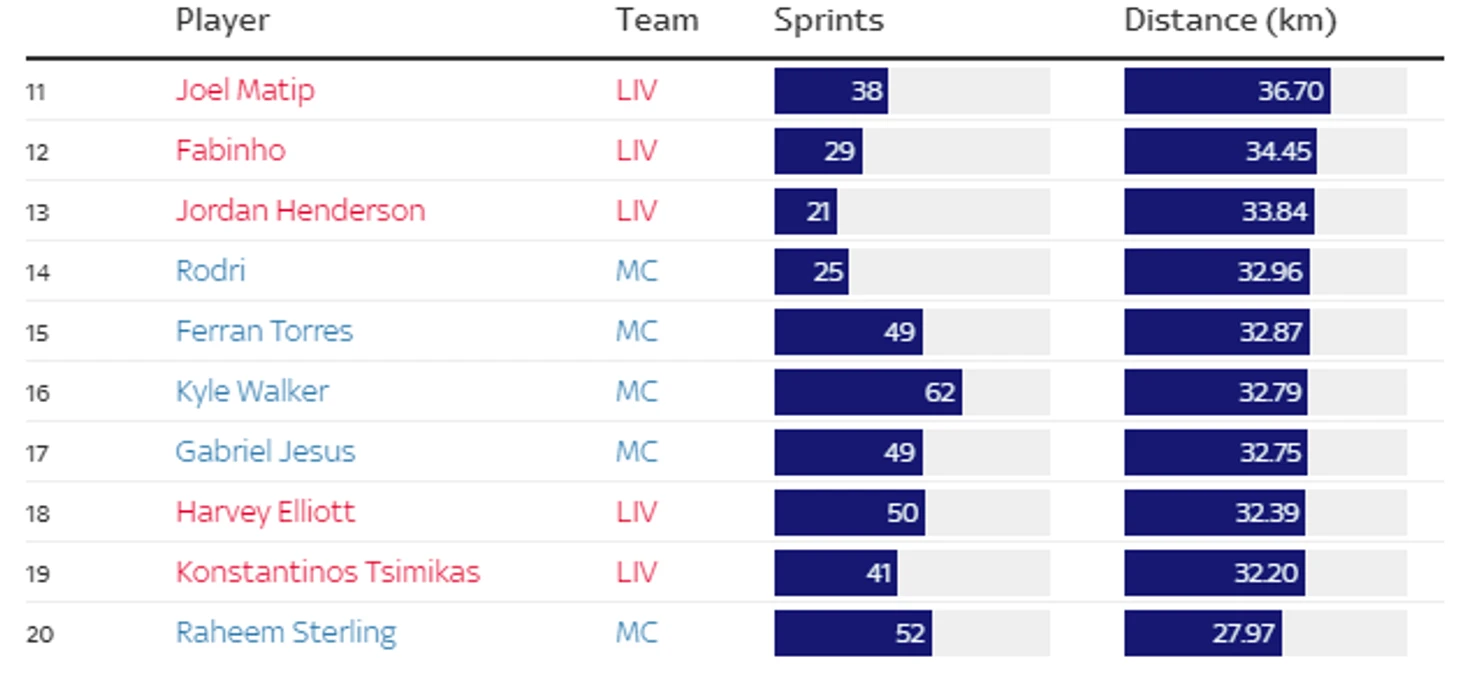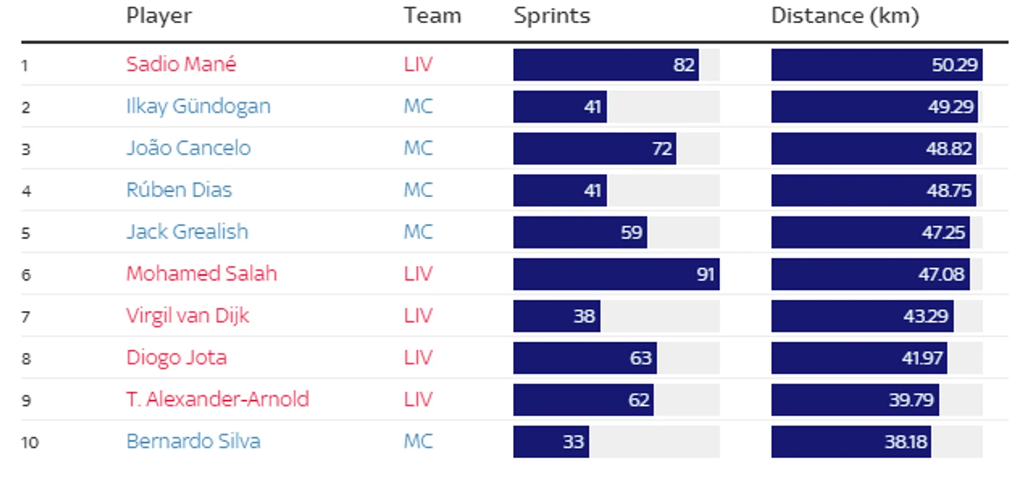 Касаемо игроков, Садио Мане пробежал больше, чем любой другой игрок из этих двух команд, но ему в спину дышат множество игроков из Сити, в том числе Илкай Гюндоган, Жоау Канселу и Рубен Диаш, которые отбегали более 48 км за шесть игр в этом сезоне,. Мане и Салах же являются безоговорочными лидерами по спринтам.