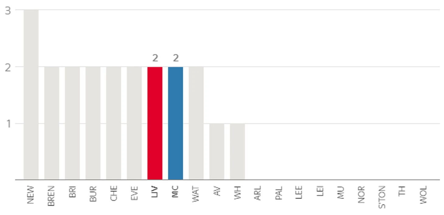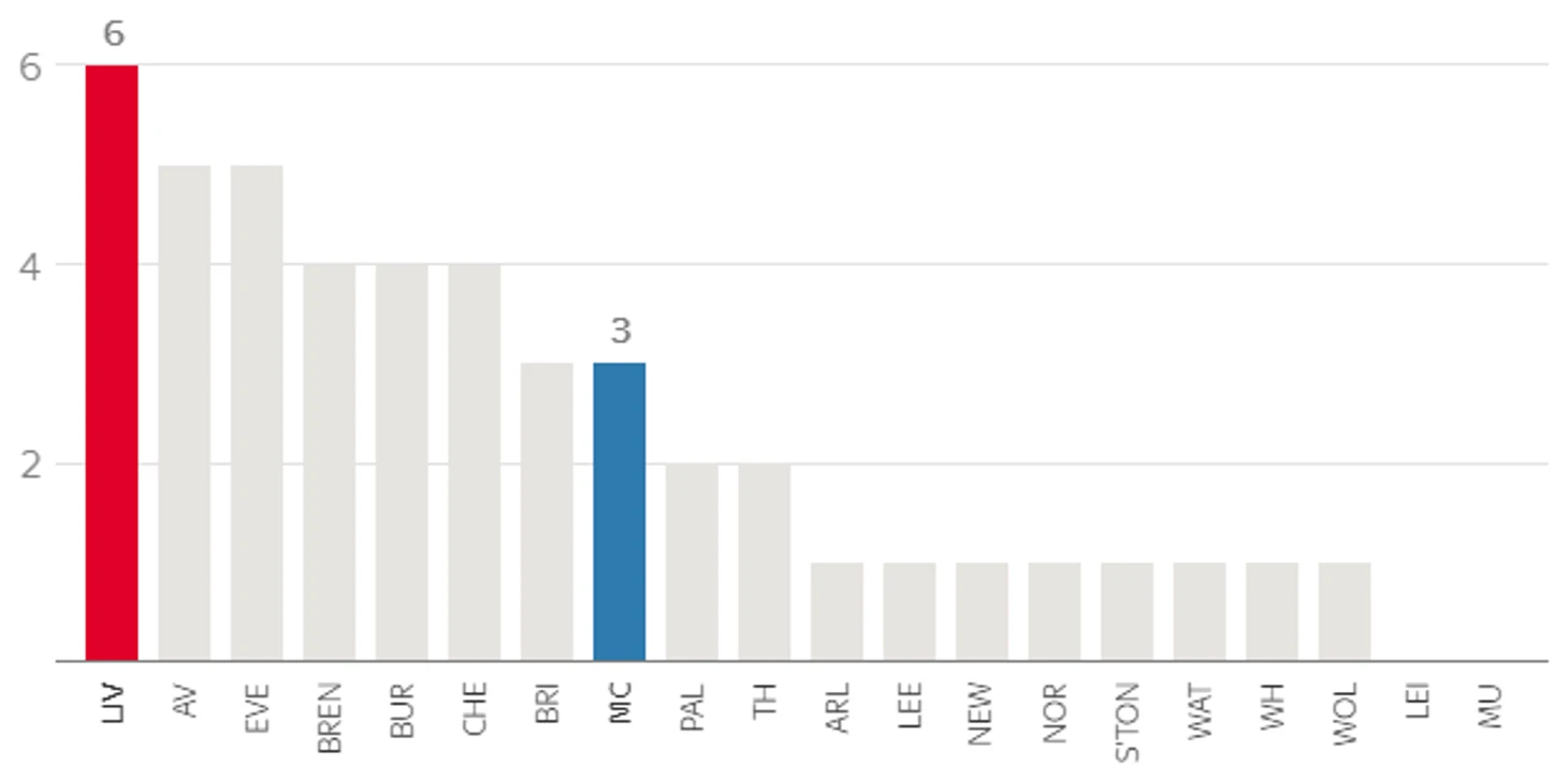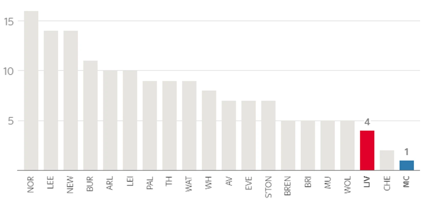 "Сити" начнет сегодняшний матч, пропустив всего 1 гол в 6-и играх чемпионата, что является ошеломляющим достижением. На бумаге защита Ливерпуля занимает 3-е место с четырьмя пропущенными голами, но 3 из них были забиты во время перестрелки 3:3 с Брентфордом на прошлой неделе.