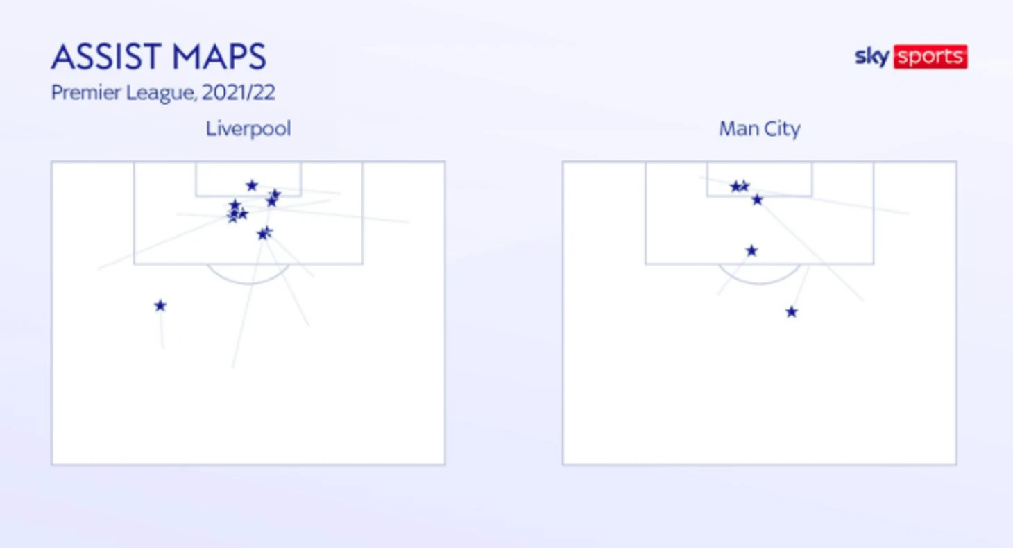 Несмотря на монотонное развитие атак, Ливерпуль почти в равной степени совершал асиссты как из флангов, так и из центра. У Сити в этом плане все более скромно: большинство голевых передач пришли из правого фланга.