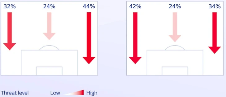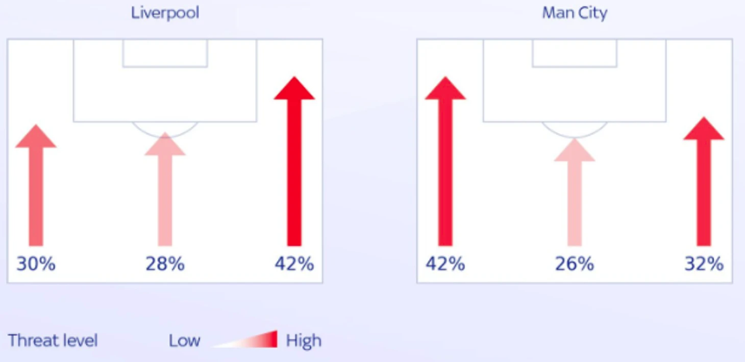 Изображение ниже показывает, что противники "Ливерпуля" любят оказывать давление именно через левый фланг, причем почти половина всех атак приходится на финальную треть поля. Неудивительно, что оппоненты Сити применили точно такой же подход, чтобы использовать свой продвинутый левый фланг.