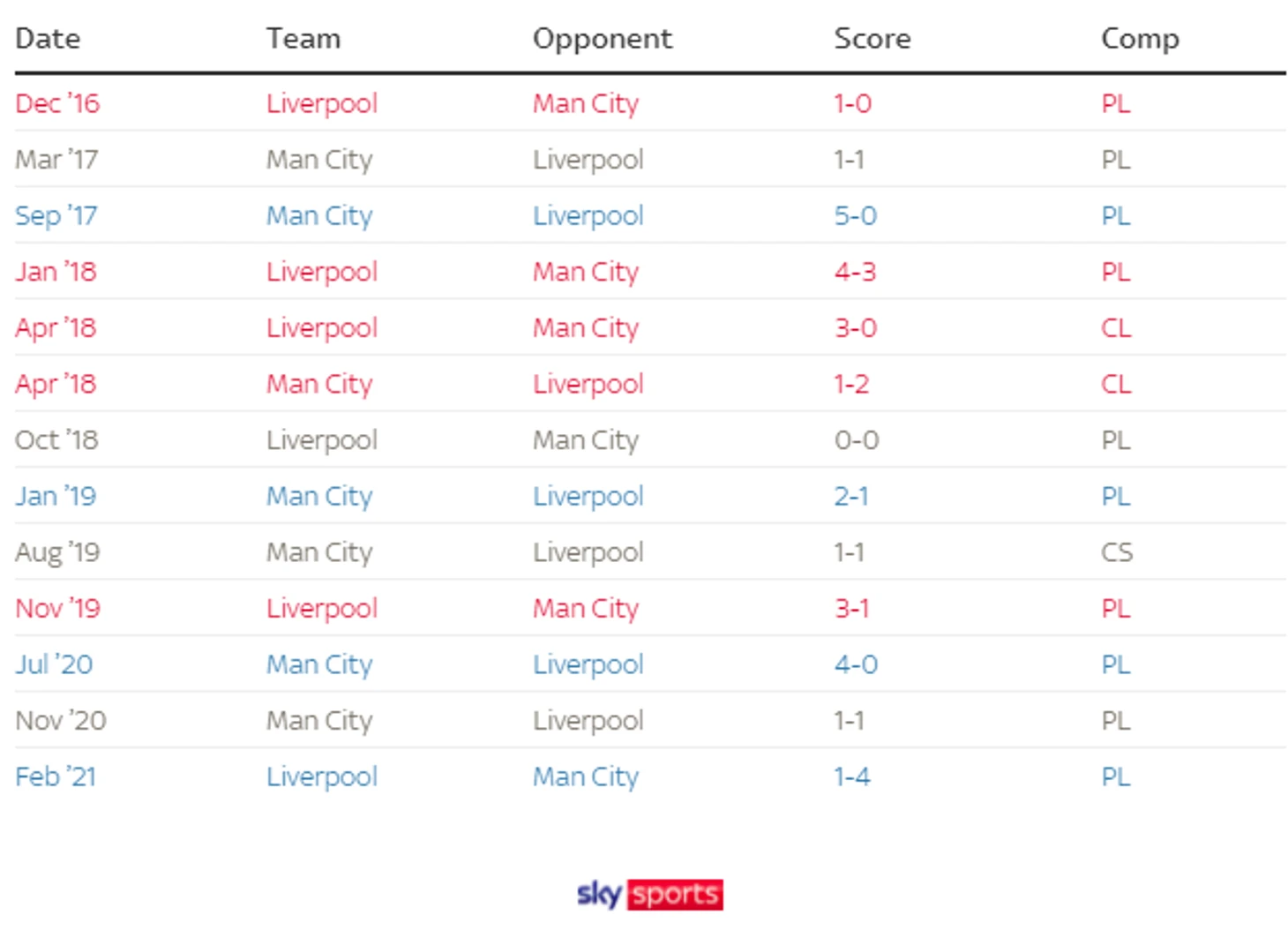 В таблице ниже перечислены предыдущие встречи между командами во всех соревнованиях, начиная с сезона 2016/17, и подчеркивается недавнее доминирование "Сити": победа со счетом 4:1 в феврале прошлого сезона и победа со счетом 4:0 в июле прошлого года. Ливерпуль был победителем со счетом 4:3 в январе 2018 года, но до этого Сити устроил разгром, победив 5:0 в сентябре 2017 года.