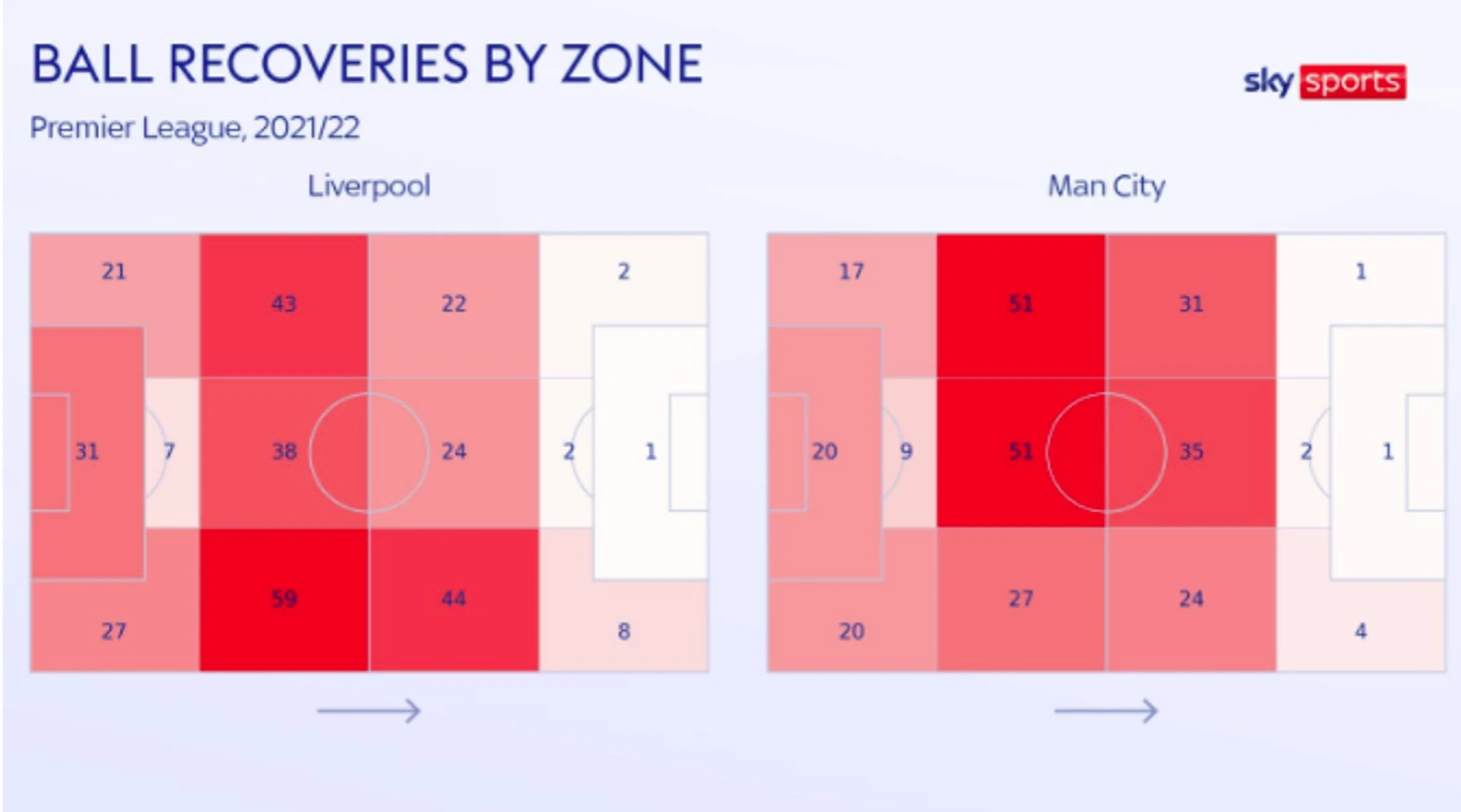 Ливерпуль обычно превосходит остальных в аспекте высокой линии обороны, но в этом сезоне подопечных Клоппа вытеснил Бернли. Тем не менее, "красные" более агрессивны, чем "Сити" в атакующей и средней трети поля.