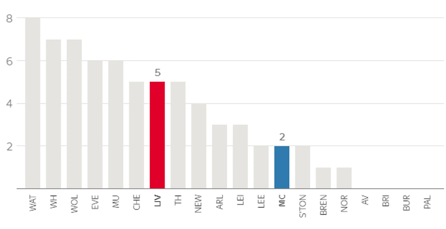 Ливерпульское трио Салах (5 голов), Диого Жота и Садио Мане (оба по 3) возглавляют список забитых мячей всех команд вместе взятых. Между тем, данные об ожидаемых голах на диаграммах выше показывают, как Ферран Торрес, Рахим Стерлинг и Грилиш раз за разом не могут воспользоваться созданными для них шансами.