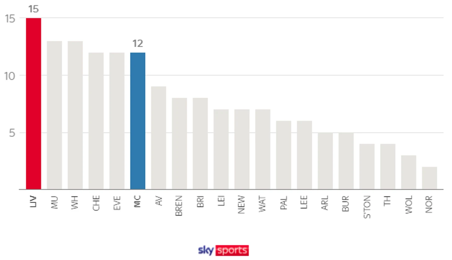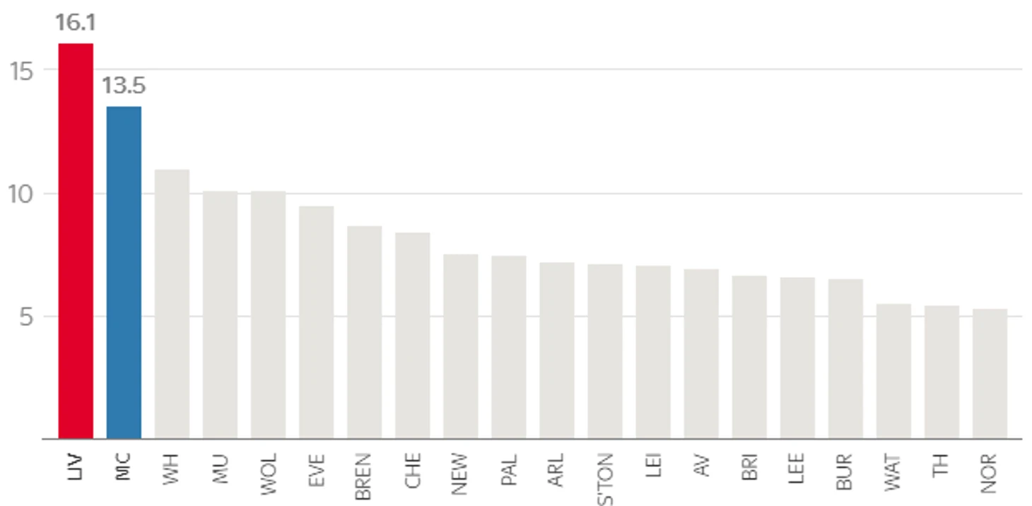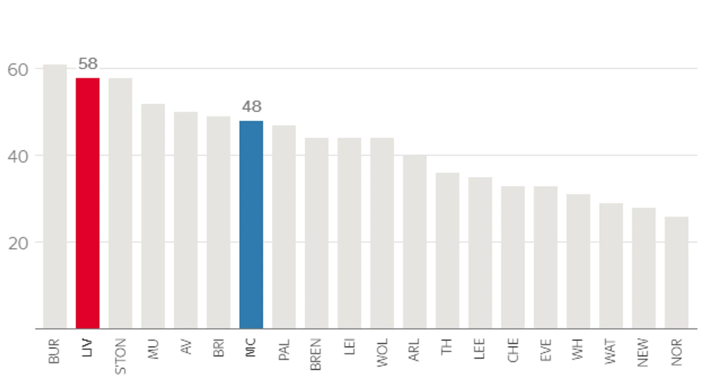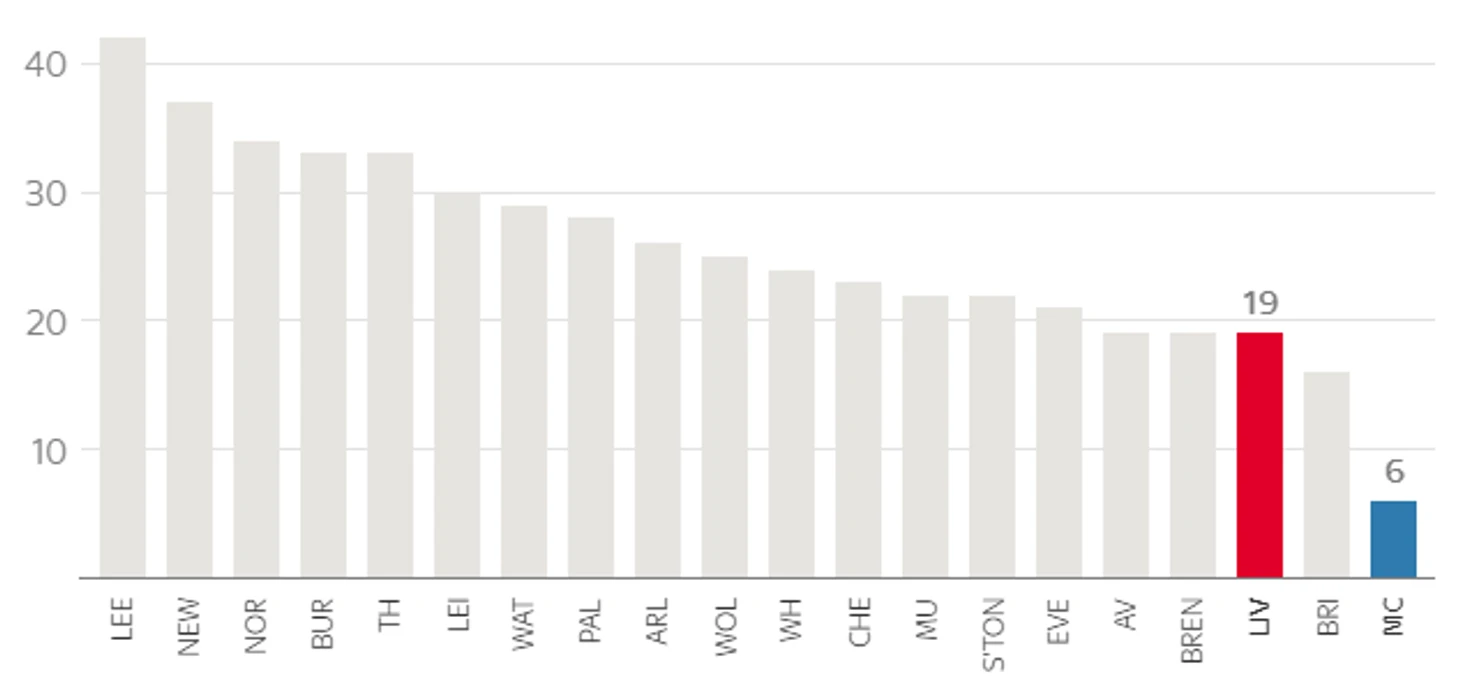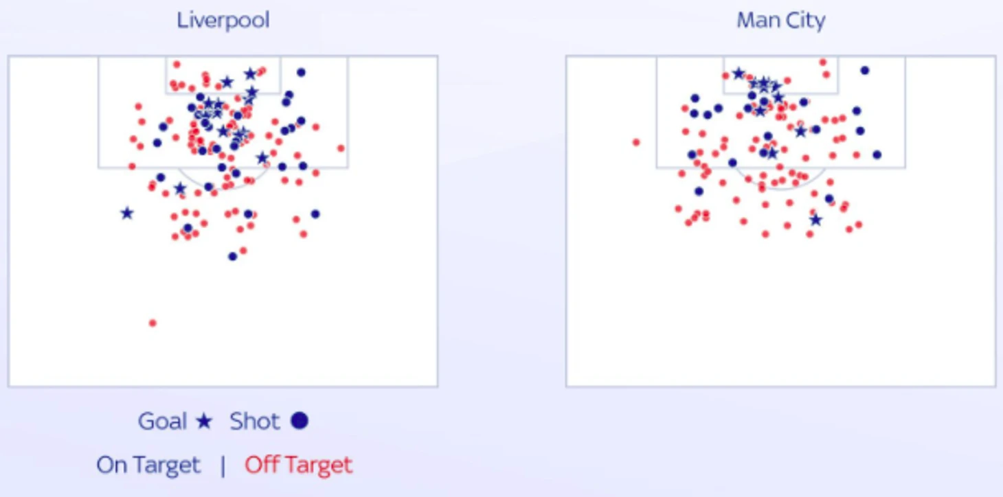 Команда Гвардиолы занимает 4-е место по забитым мячам, но подопечные Клоппа в этом аспекте являются беспрекословными лидерами, поразив ворота оппонентов 15 раз. Данные по ожидаемым голам подчеркивают значительную силу МС близ штрафной соперника, но это усугубляется весьма скромным количеством ударов в створ ворот.